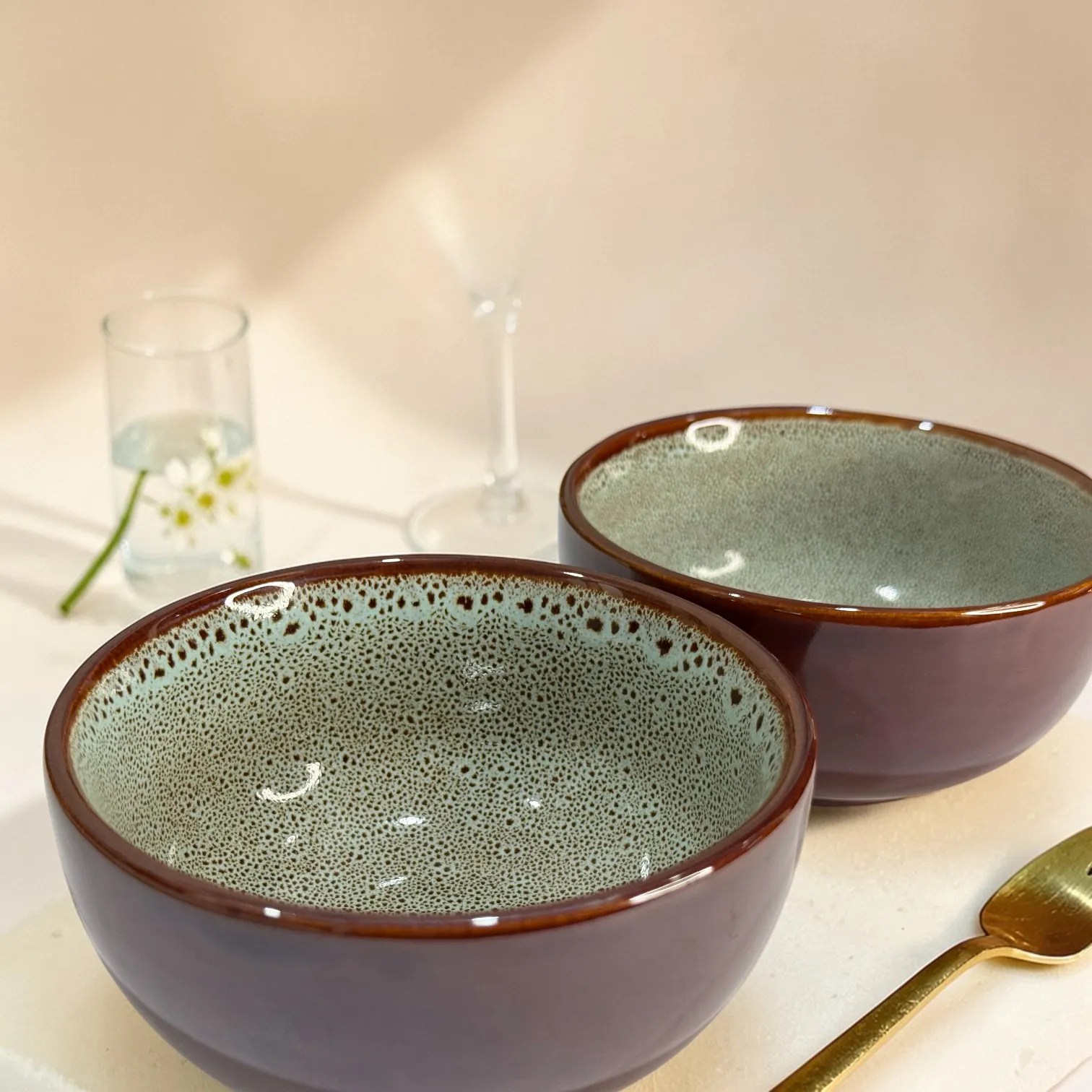 What stands out immediately is the glaze story. The outer surface has a deep, warm burnt-brown finish that feels grounded, rich, and elegant, while the inside features a textured speckled glaze in muted beige-grey tones that adds depth and artisanal character. This contrast gives the bowls a handcrafted, boutique-ceramics appeal that photographs beautifully and instantly upgrades simple meals. Whether placed on a neutral tablescape, paired with wooden servers, styled with brass cutlery, or mixed with cream and stoneware dinnerware, these bowls create a refined yet earthy mood.