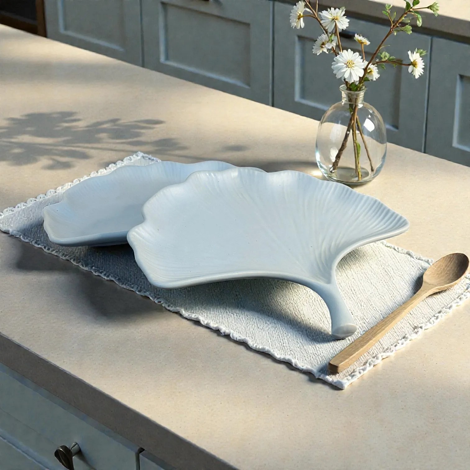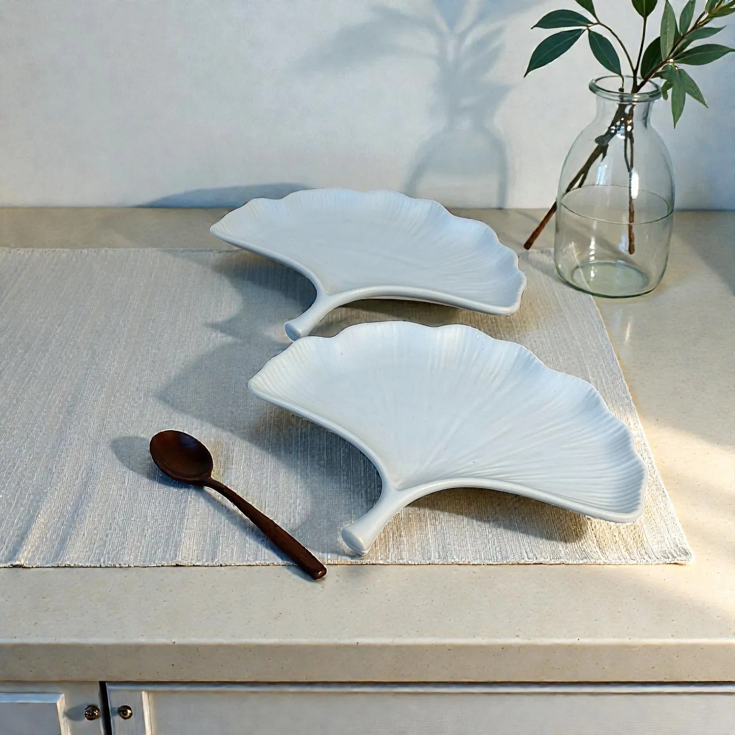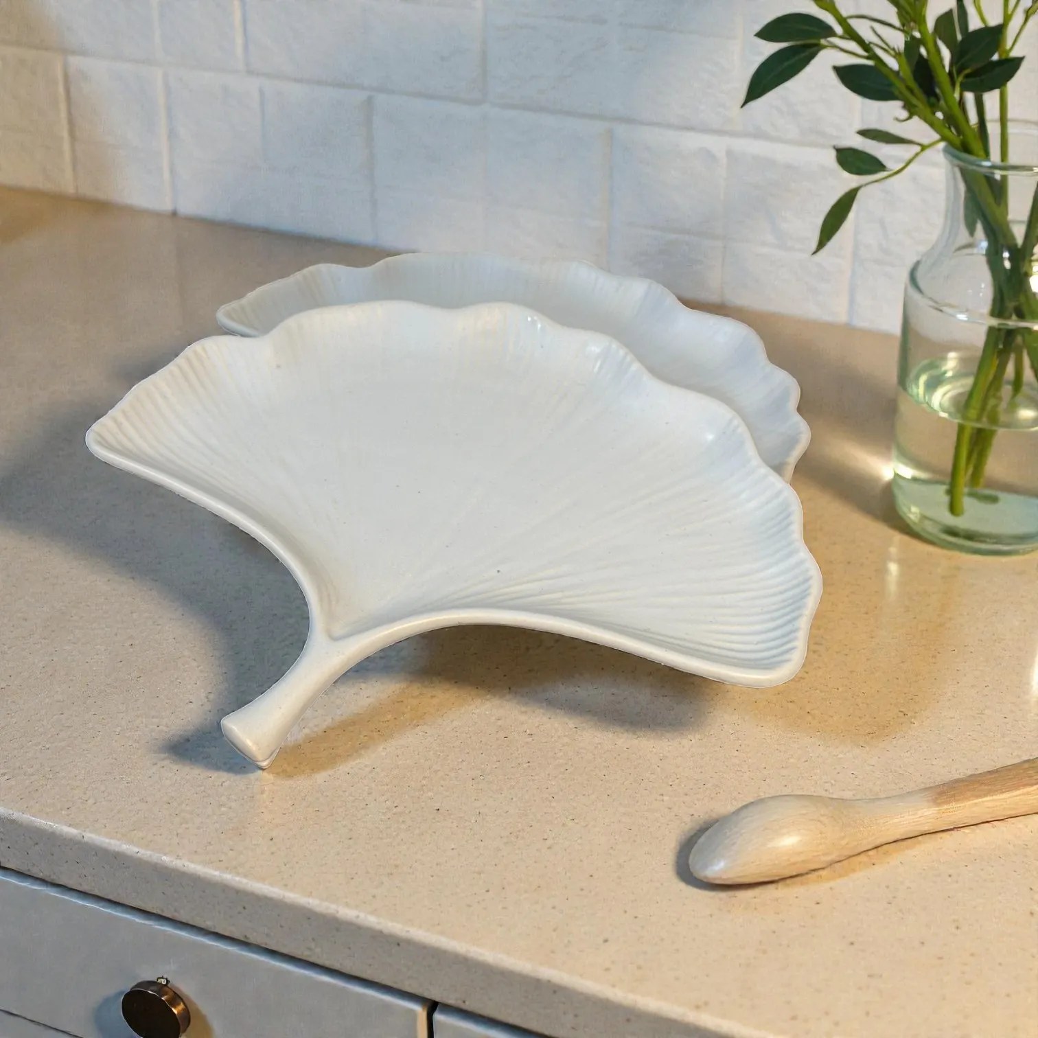 Bring airy elegance to your table with the Harmiche CloudNest Leaf Ceramic Platters (Set of 2). Inspired by the soft, fan-like sweep of a ginkgo leaf, each platter has a gently scalloped rim and delicate vein texture that catches light beautifully—minimal, modern, and instantly Made to Impress. The bright cloud-white tone keeps the look clean and premium, while the sculpted stem-style handle becomes a built-in grip for effortless serving and easy passing at the table.
