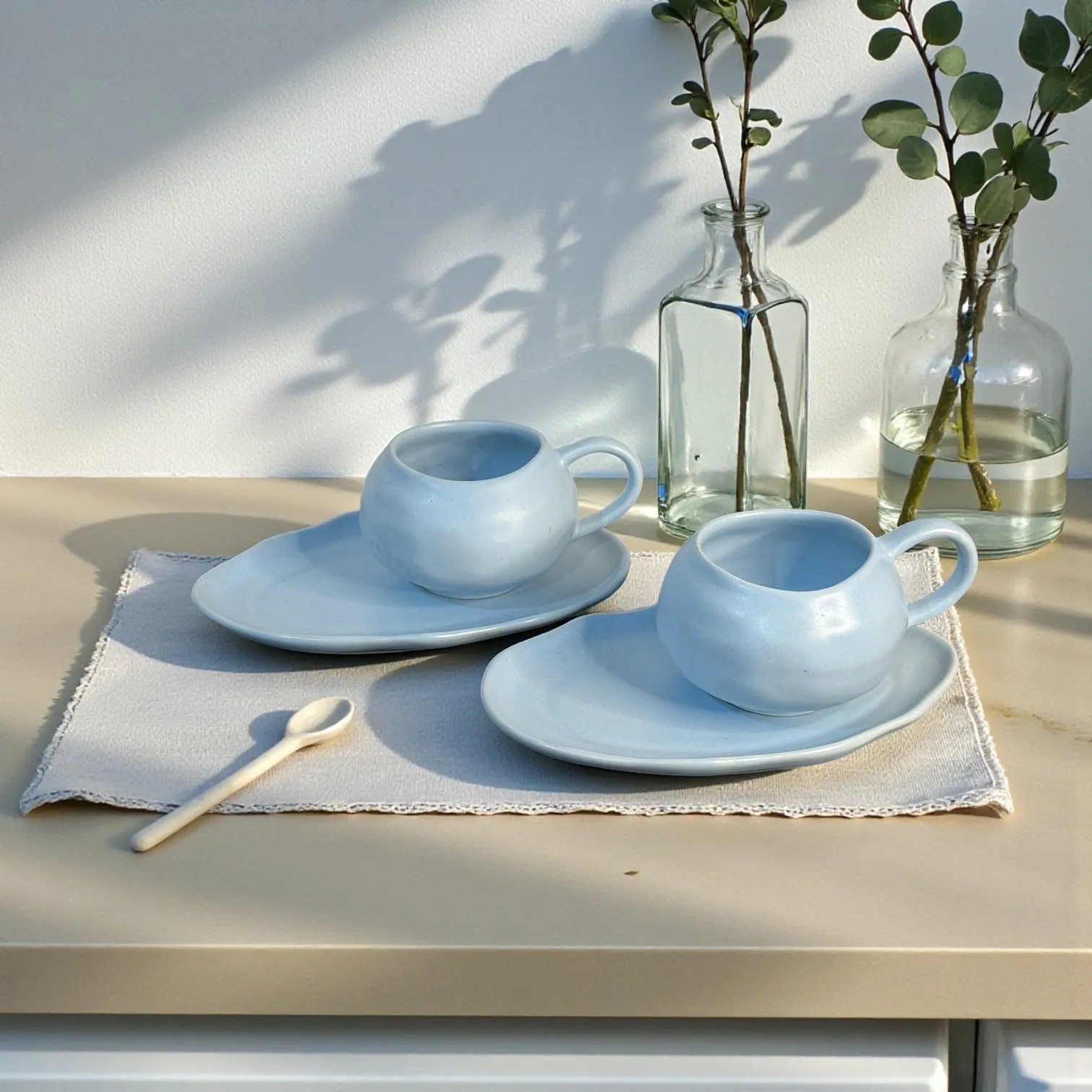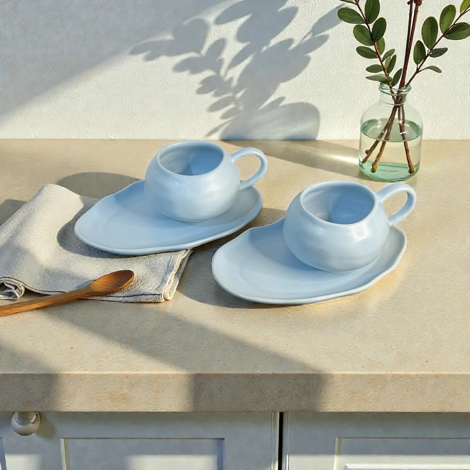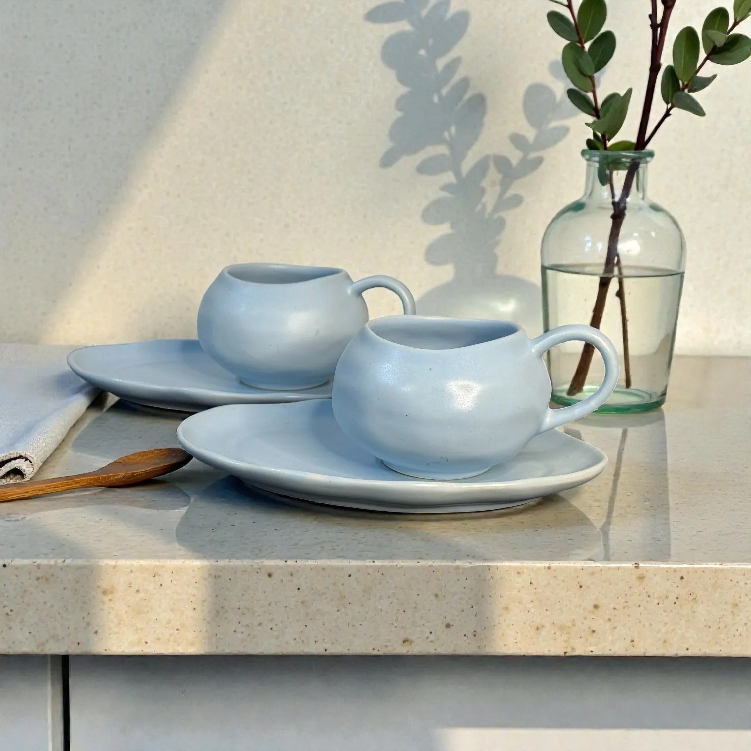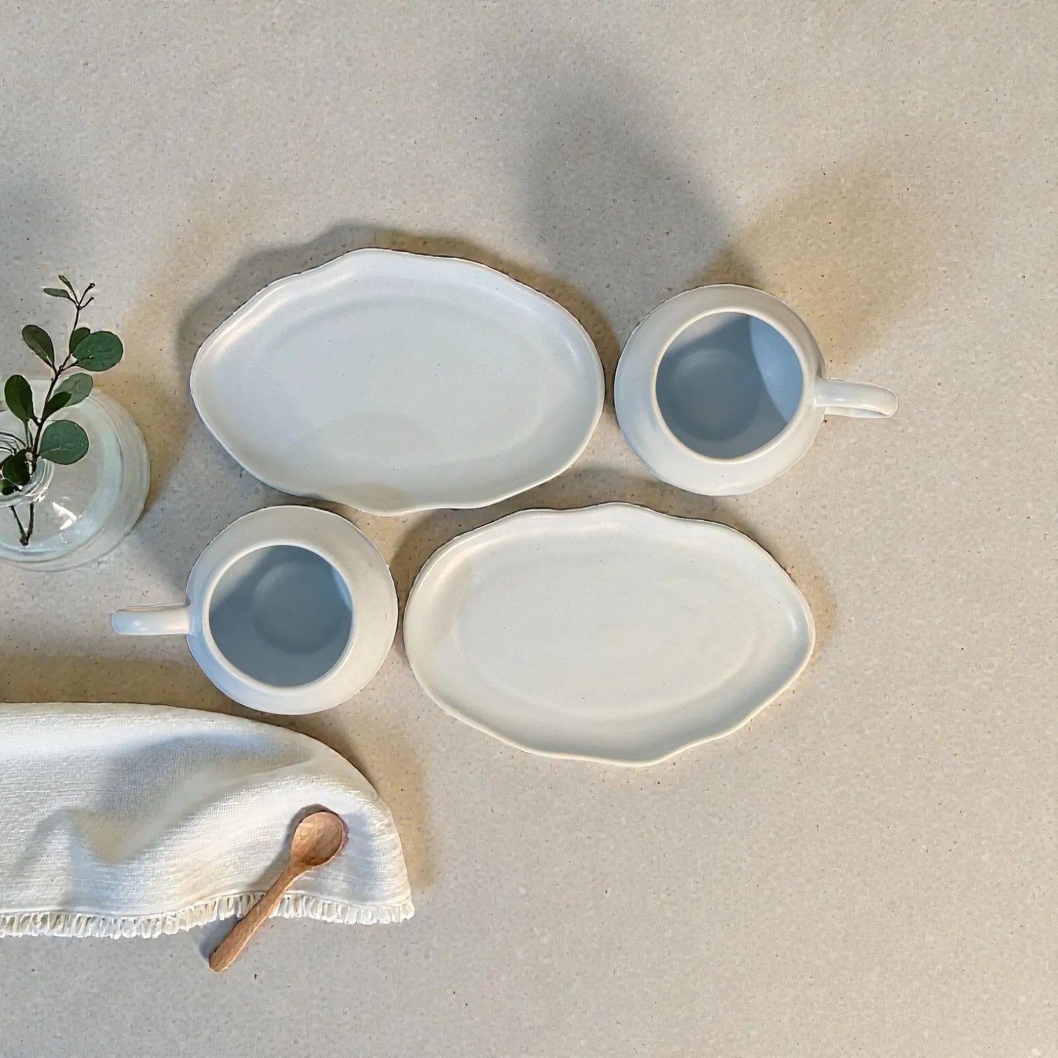 Cloud-inspired design: Rounded cups + organic oval saucers with gentle wave edges