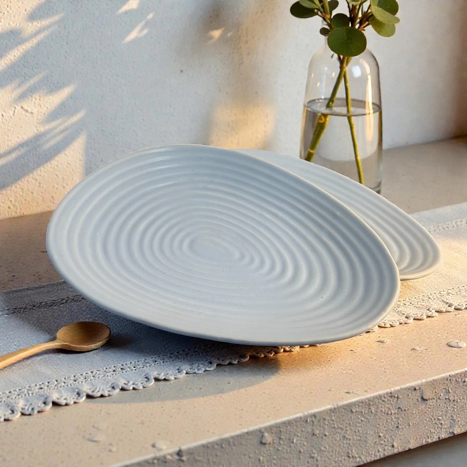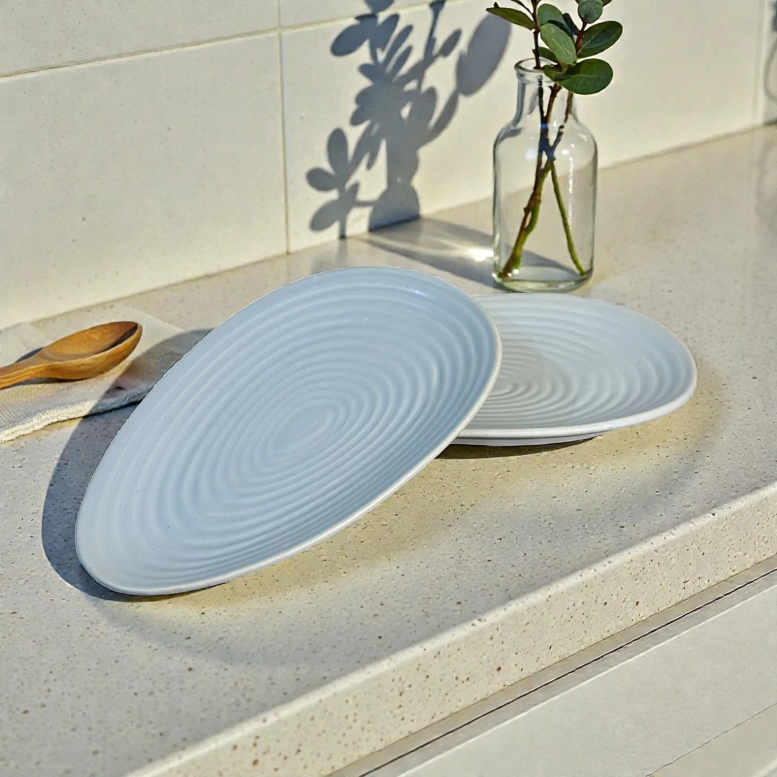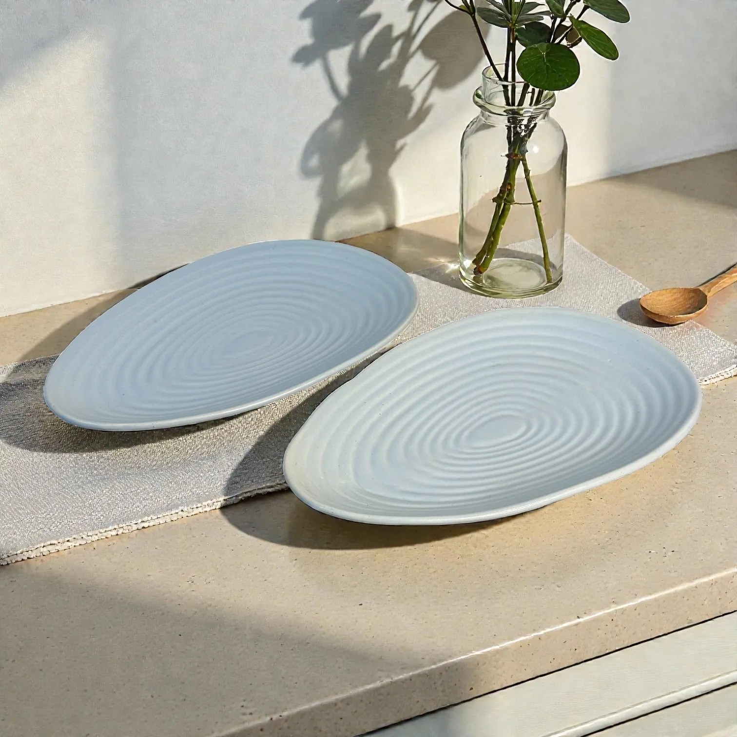 Meet the Harmiche CloudNest Ripple Oval Ceramic Platters (Set of 2) โ a calm, cloud-blue statement for modern serving. Inspired by gentle water rings, each platter features subtle concentric ripples that catch the light beautifully and make even simple snacks look curated. The soft oval silhouette feels contemporary yet timeless, while the pastel tone pairs effortlessly with whites, wood, brass cutlery and your dinnerware.