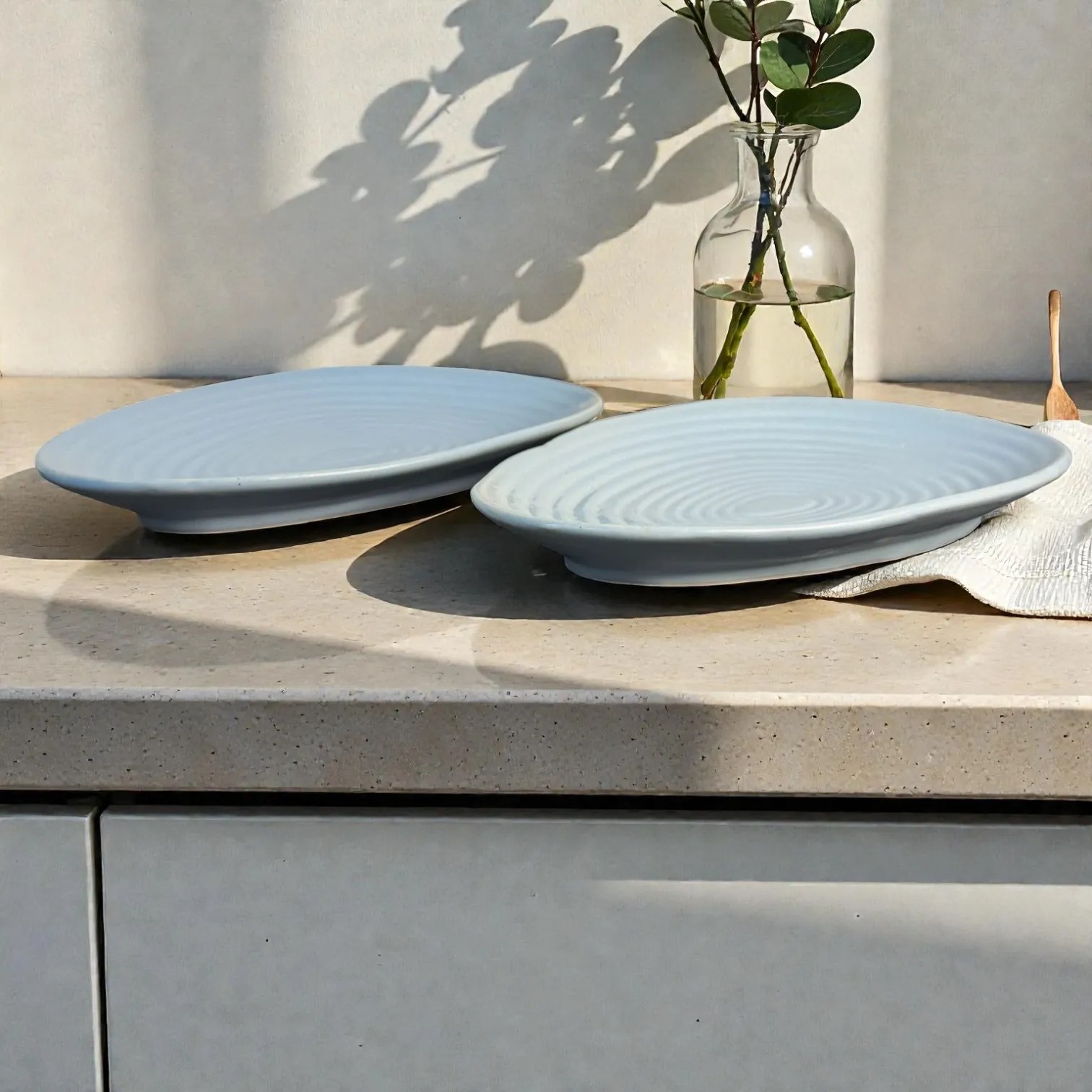 Brand: Harmiche | Product type: ceramic serving platters / oval platters | Set size: 2 | Dimensions: 30 x 18.5 cm | Colour: CloudNest mist blue | Design: ripple texture, oval silhouette | Use: appetisers, snacks, desserts, serving, table dรฉcor | Ideal for: housewarming gifts, wedding gifts, festive hosting, everyday luxury.