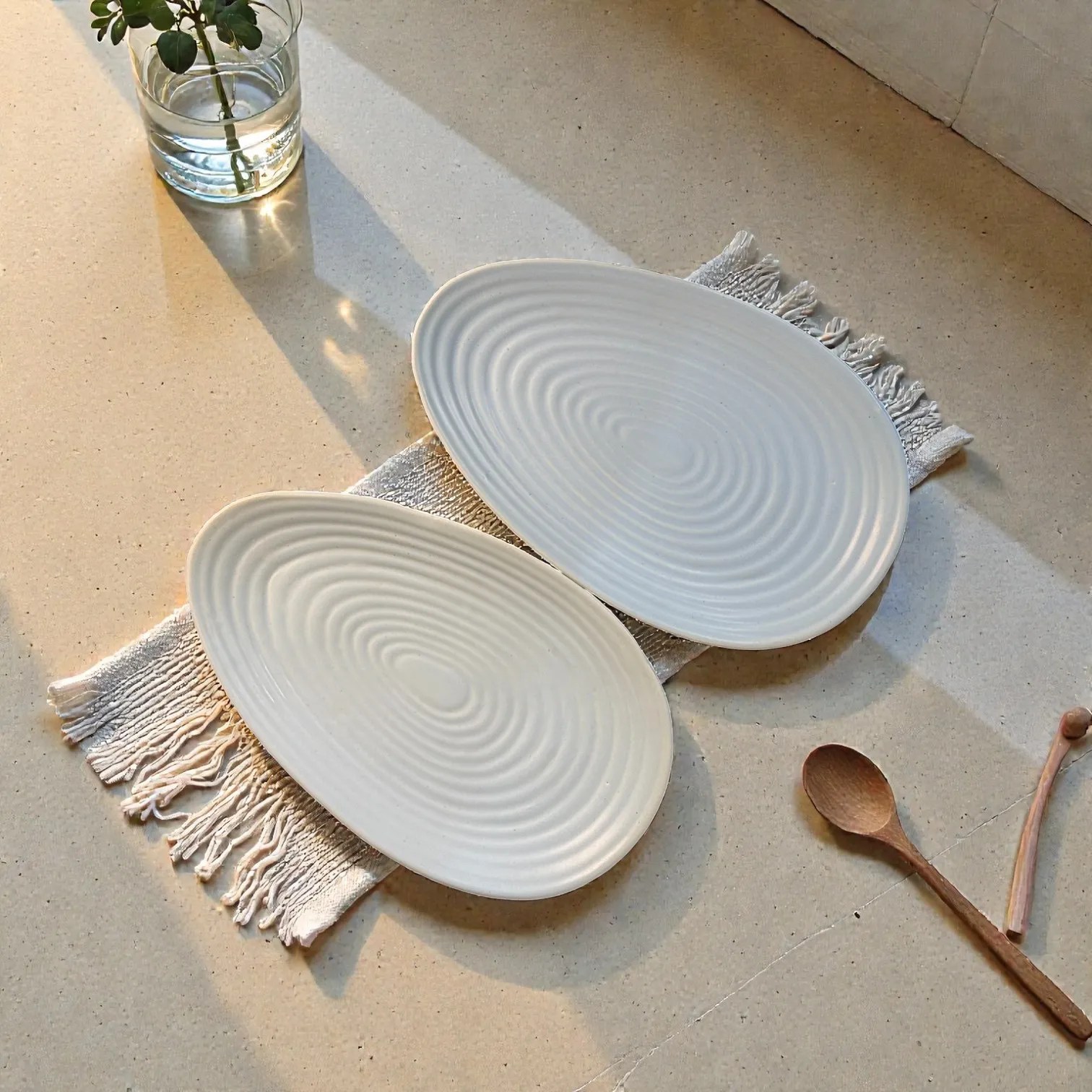 These platters are made for the moments that matter: mezze spreads, bruschetta, sushi, kebabs, cupcakes, brownies, fruit, tea-time snacks, or a duo of dips with crackers. Use one for savoury and one for sweetโyour table instantly feels like a hosted spread. The elongated oval shape helps you layer food, garnish and sauces without overcrowding, while the ripple texture creates subtle highlights under natural light.