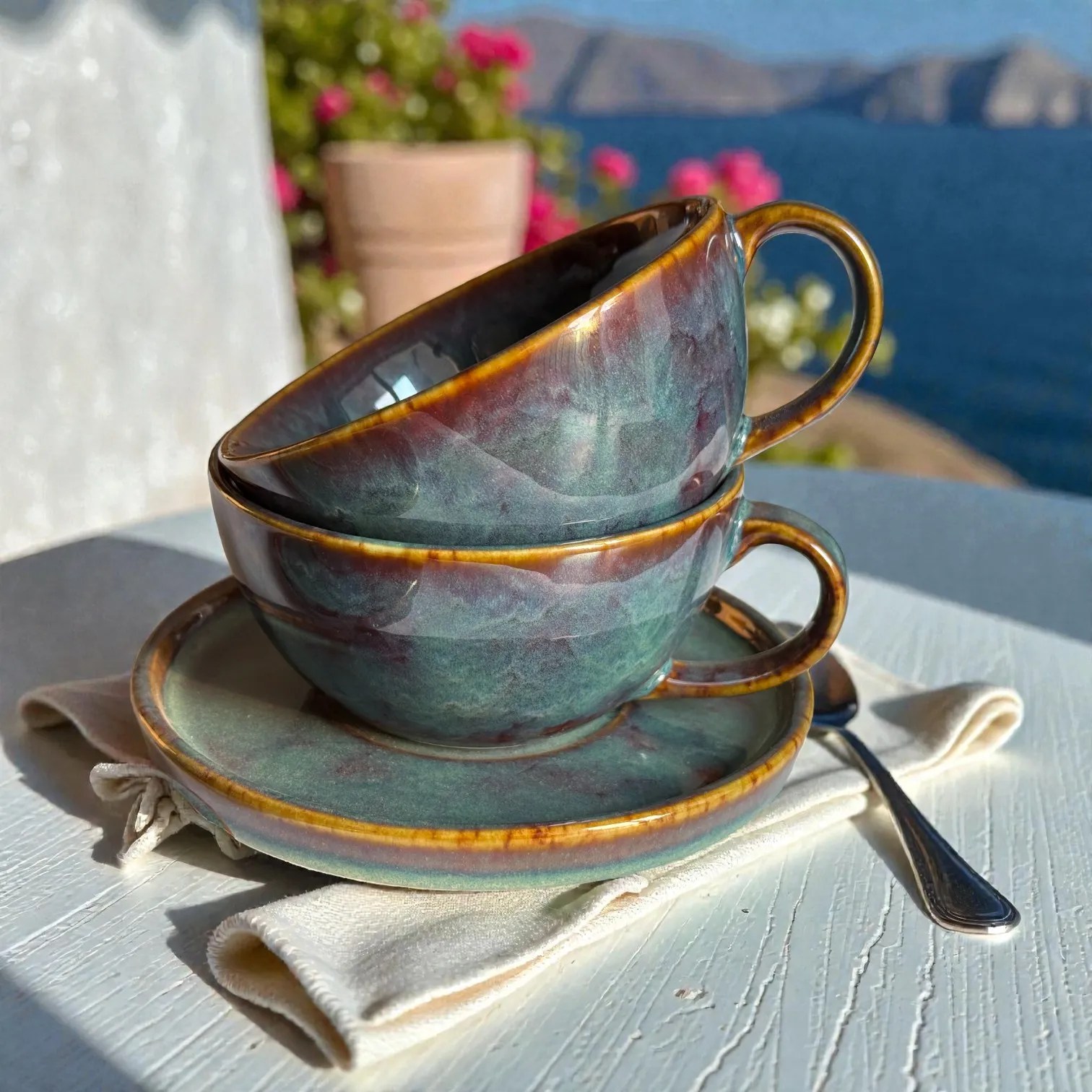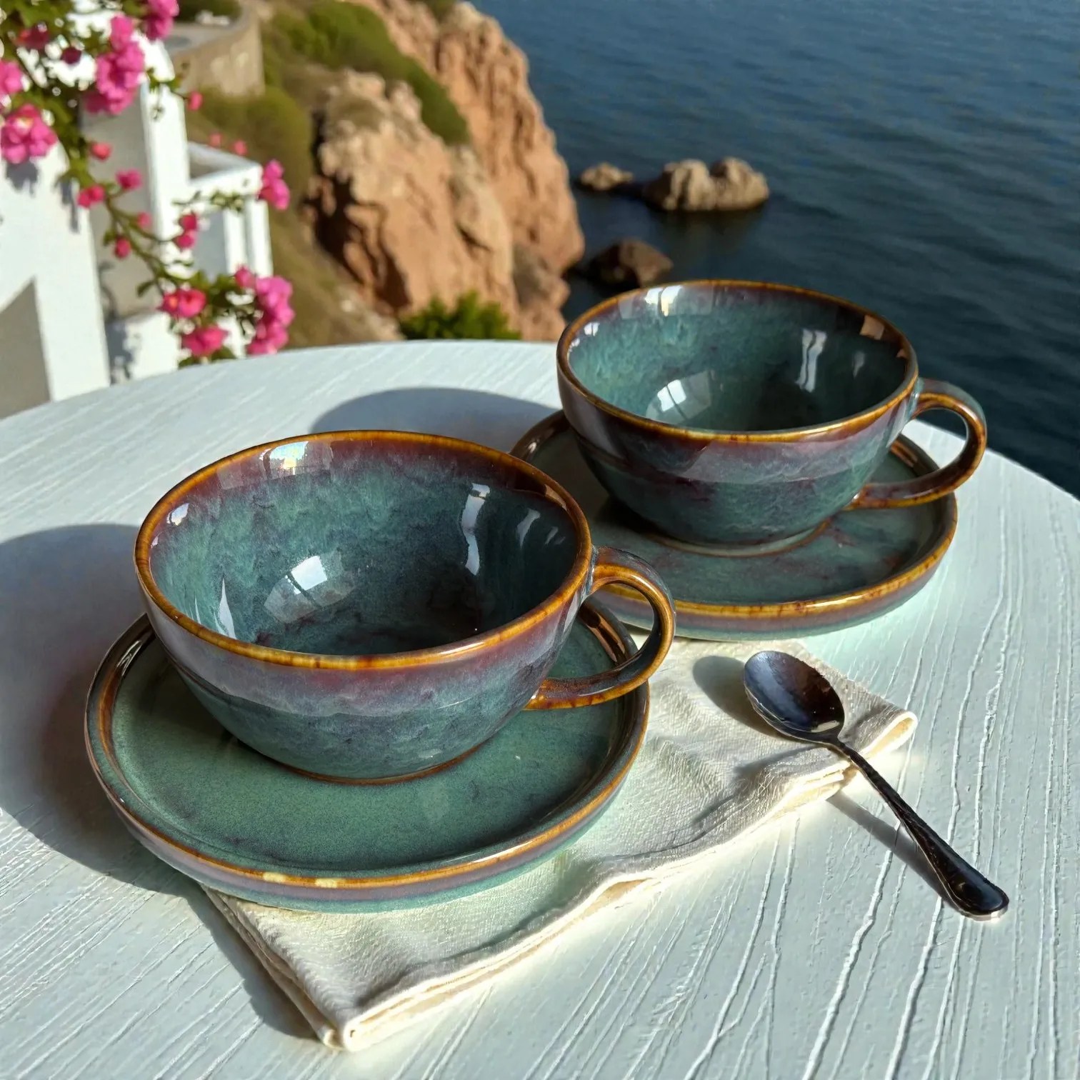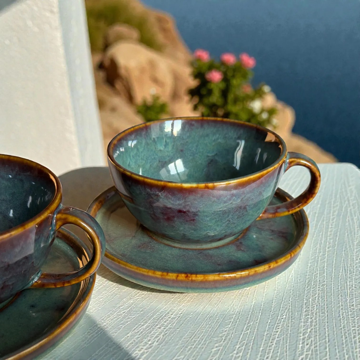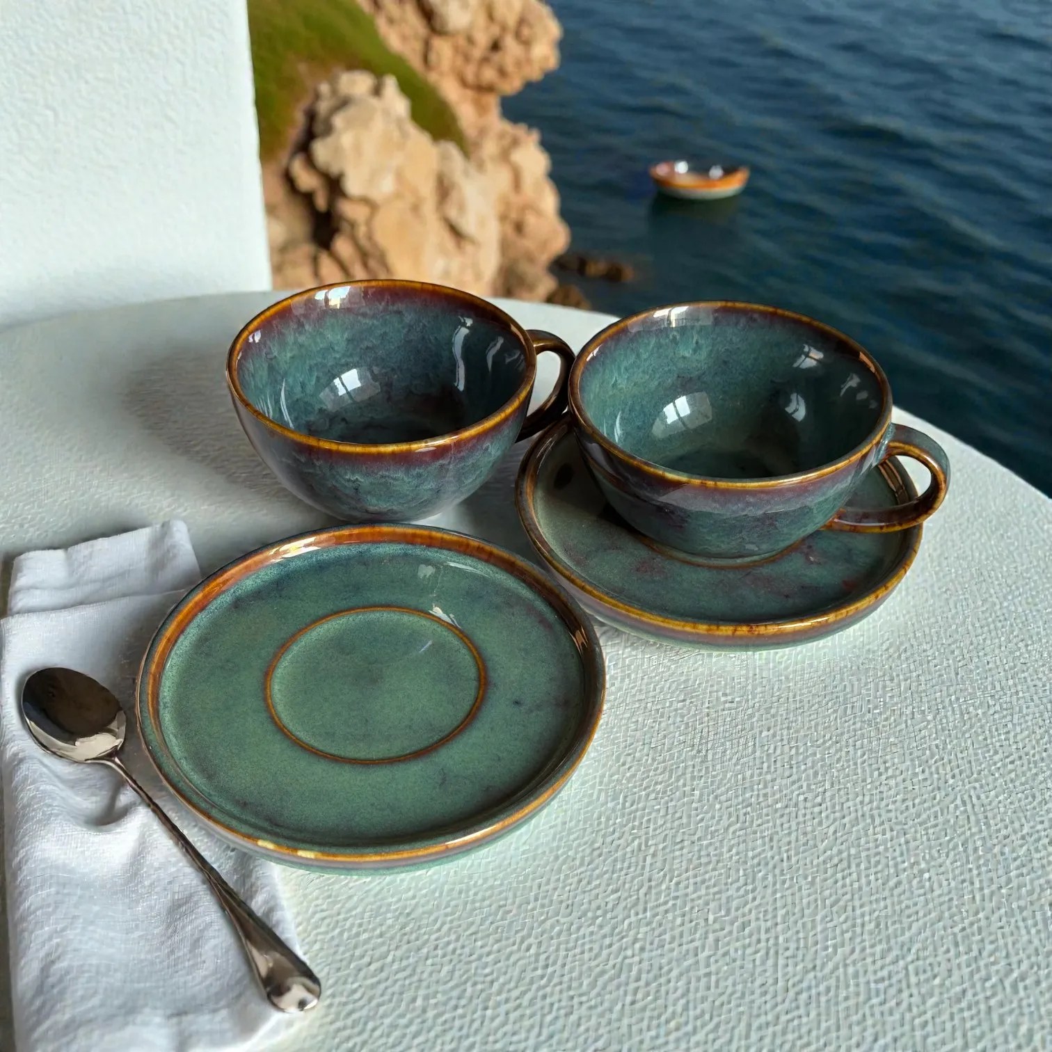 Crafted in glazed ceramic and fired for durability, this ceramic coffee cup set is made for everyday use while looking special enough for guests. Use it at your breakfast table, in your work-from-home corner, or as your go-to hosting set when friends drop in. It also photographs beautifully — the moody glaze and warm rim detail pop against marble, wood, linen, travertine, and minimalist kitchen backdrops (perfect for reels, tablescapes, and product styling). It’s equally suited for home cafés, boutique stays, and hospitality setups that want a premium, coordinated cup-and-saucer look.