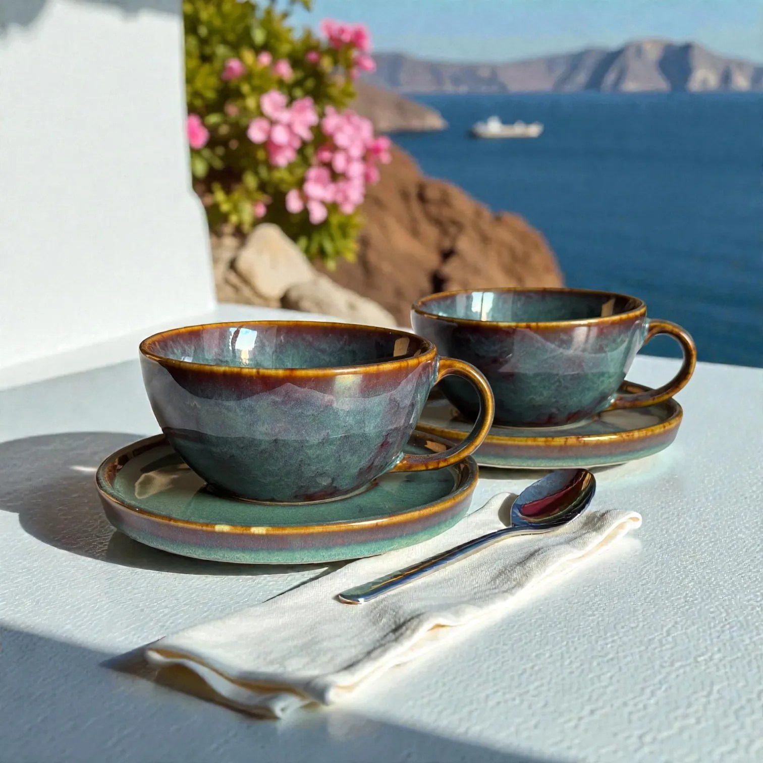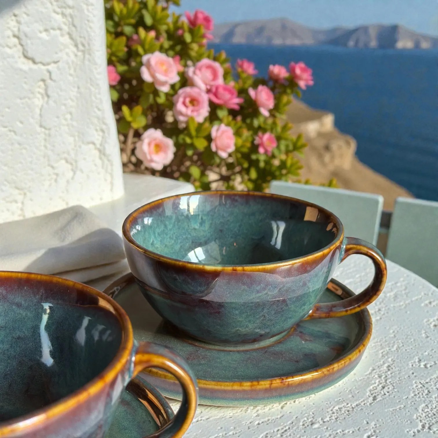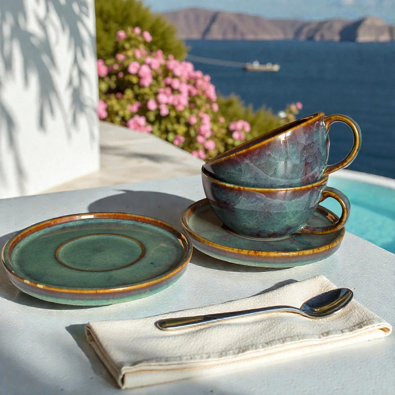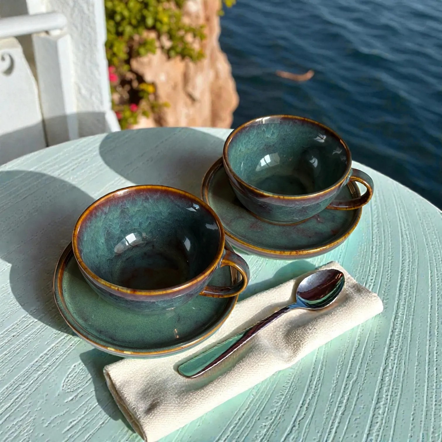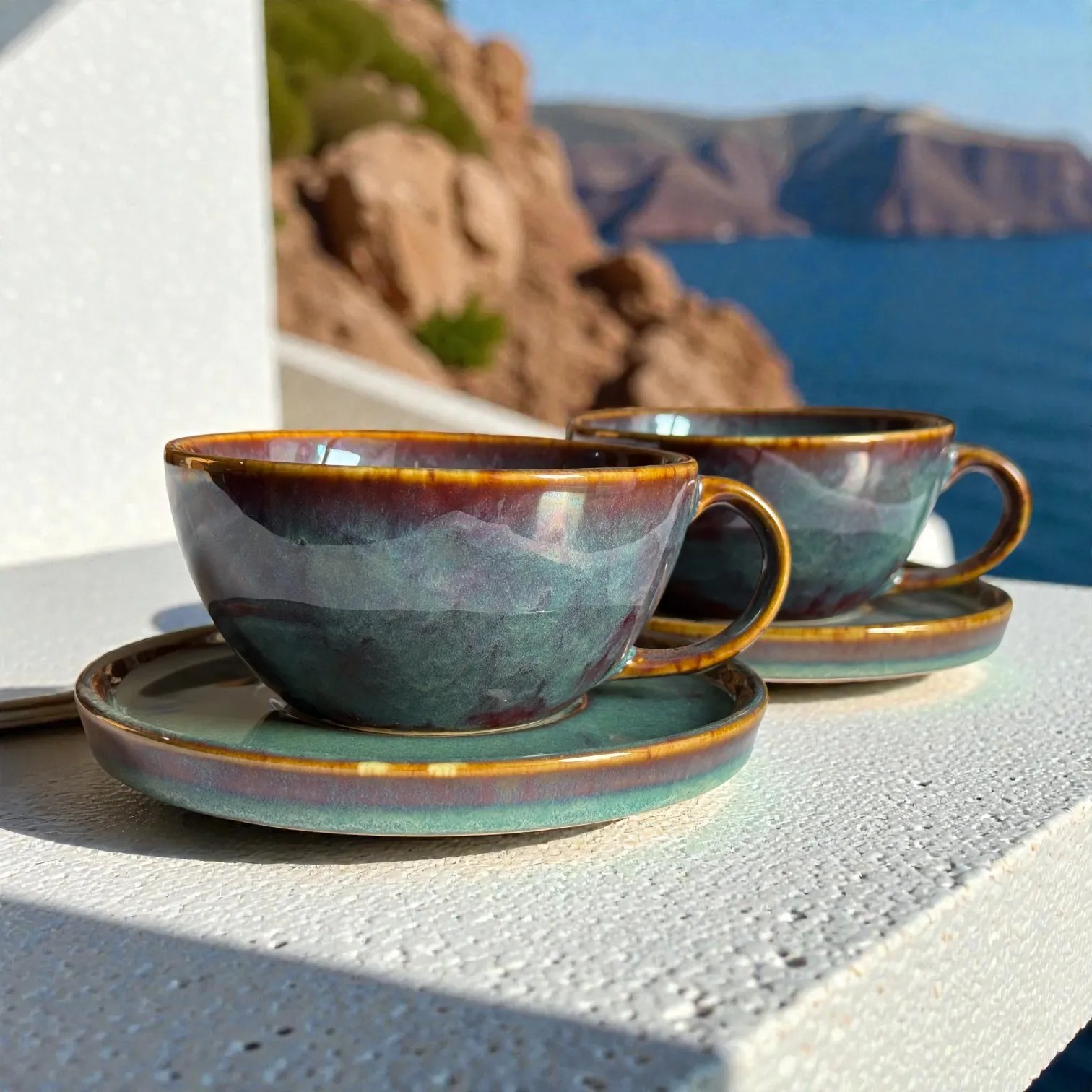 Crafted in glazed ceramic and fired for durability, this ceramic coffee cup set is made for everyday use while looking special enough for guests. Use it at your breakfast table, in your work-from-home corner, or as your go-to hosting set when friends drop in. It also photographs beautifully — the moody glaze and warm rim detail pop against marble, wood, linen, travertine, and minimalist kitchen backdrops (perfect for reels, tablescapes, and product styling). It’s equally suited for home cafés, boutique stays, and hospitality setups that want a premium, coordinated cup-and-saucer look.