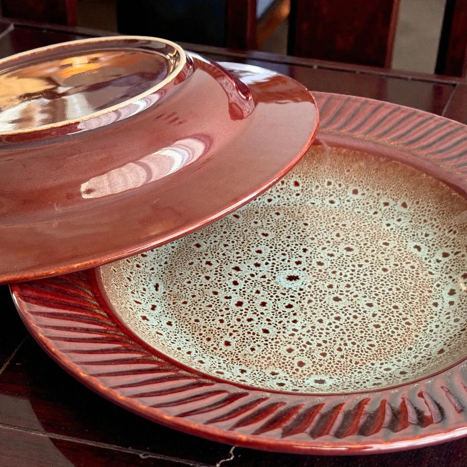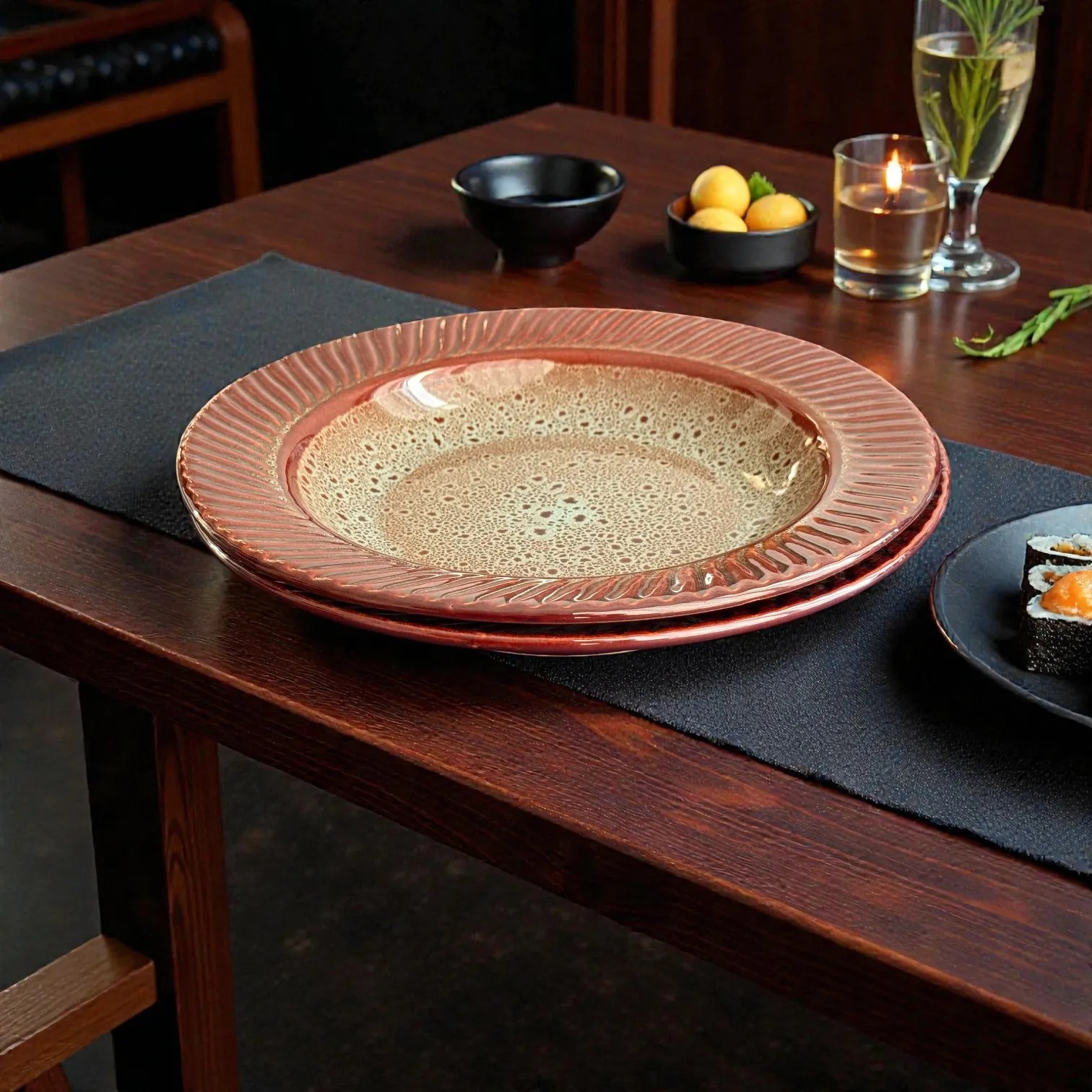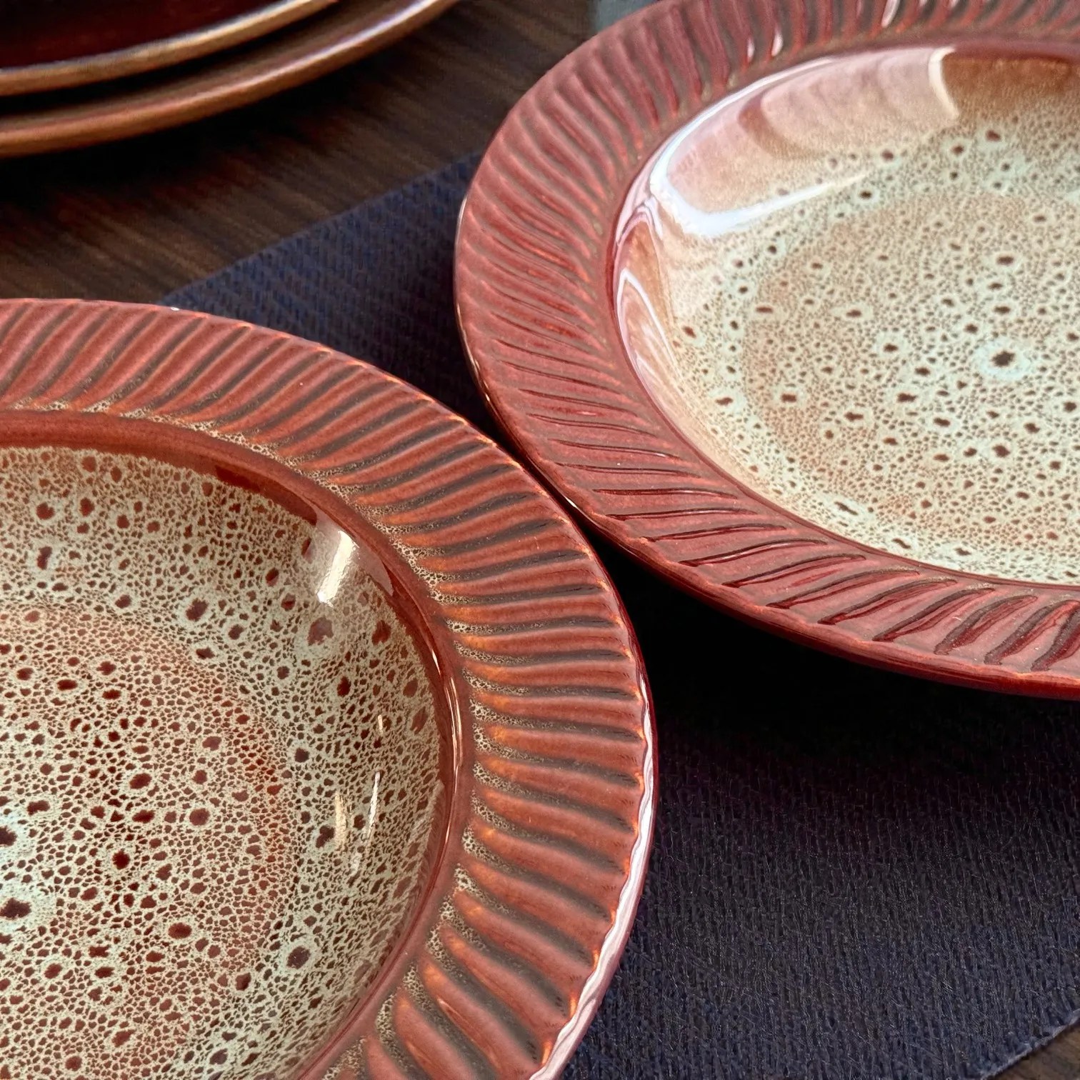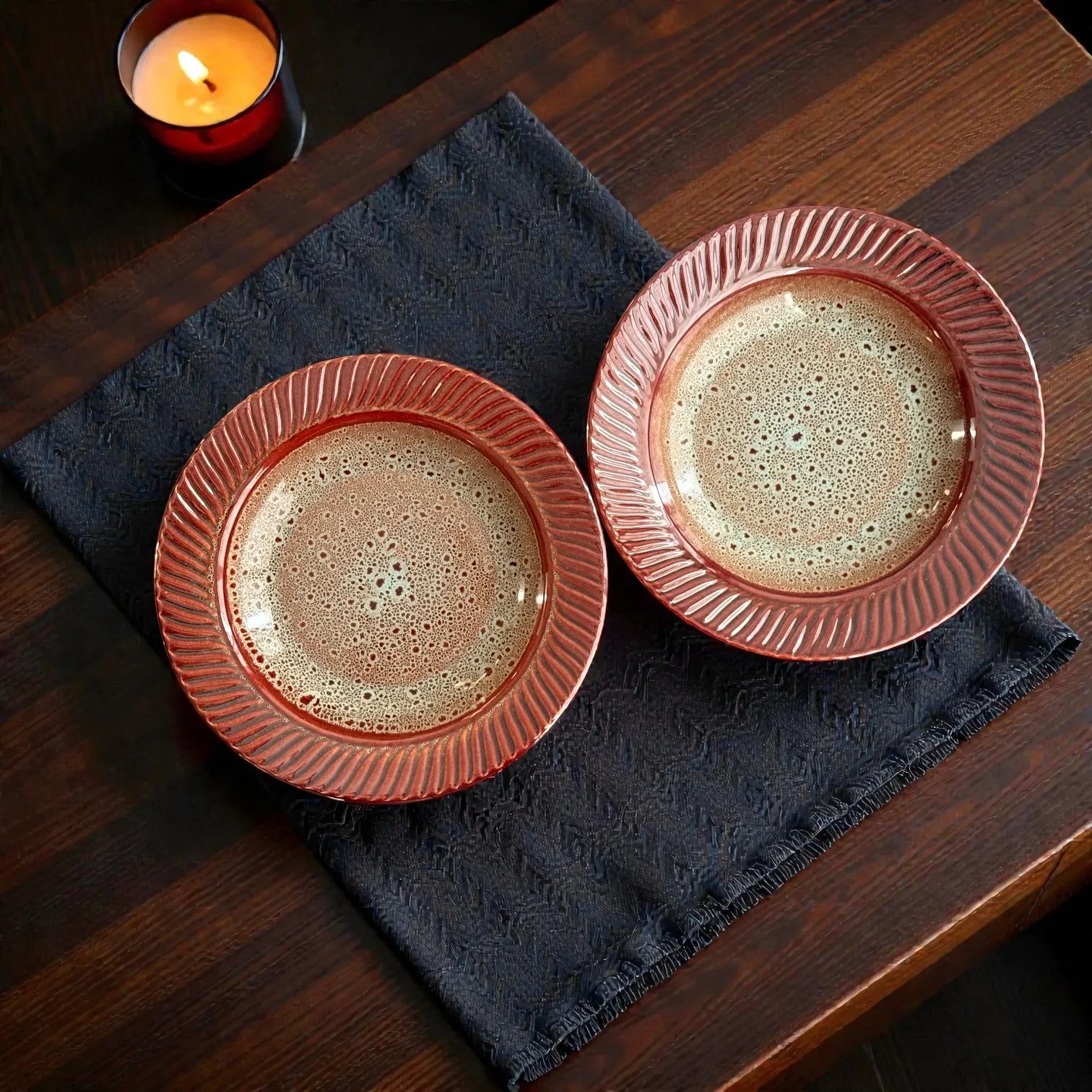 The BurntAmber glaze is the hero here: a warm, earthy outer tone paired with a speckled, artisan-look interior that feels curated and premium on the table. The subtle texture and handcrafted character create depth under warm lighting—perfect for hosting, date-night dinners, or simply upgrading your daily lunch routine. These plates are made for the kind of photos that stop thumbs: glossy highlights on the rim, a rich amber body, and a refined neutral centre that makes food colours pop.