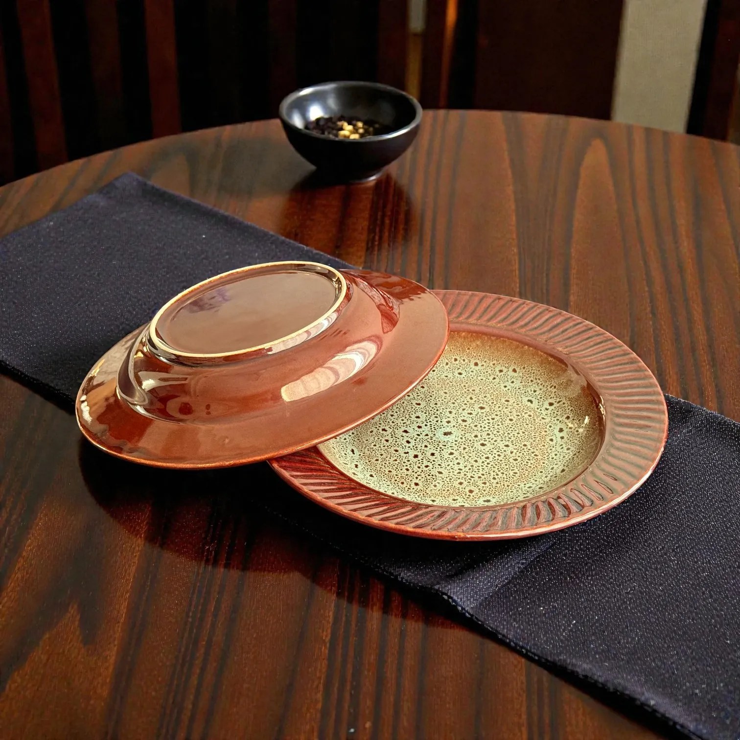 As with all handcrafted ceramics, each piece carries natural variations in glaze flow, speckling, and tone—small details that make every set feel one-of-a-kind. The BurntAmber finish pairs beautifully with darker table runners, wooden tables, neutral linens, and minimal cutlery, making it an effortless match for modern Indian and contemporary interiors.