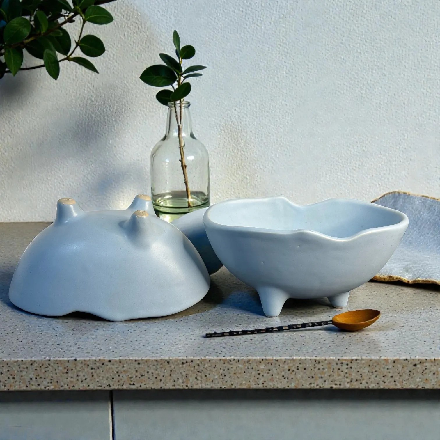 Pair the matte sky blue with natural textures—linen runners, light wood trays, or stone countertops—for a high-end, editorial look. Add a brass spoon or wooden cutlery to create a luxe contrast.