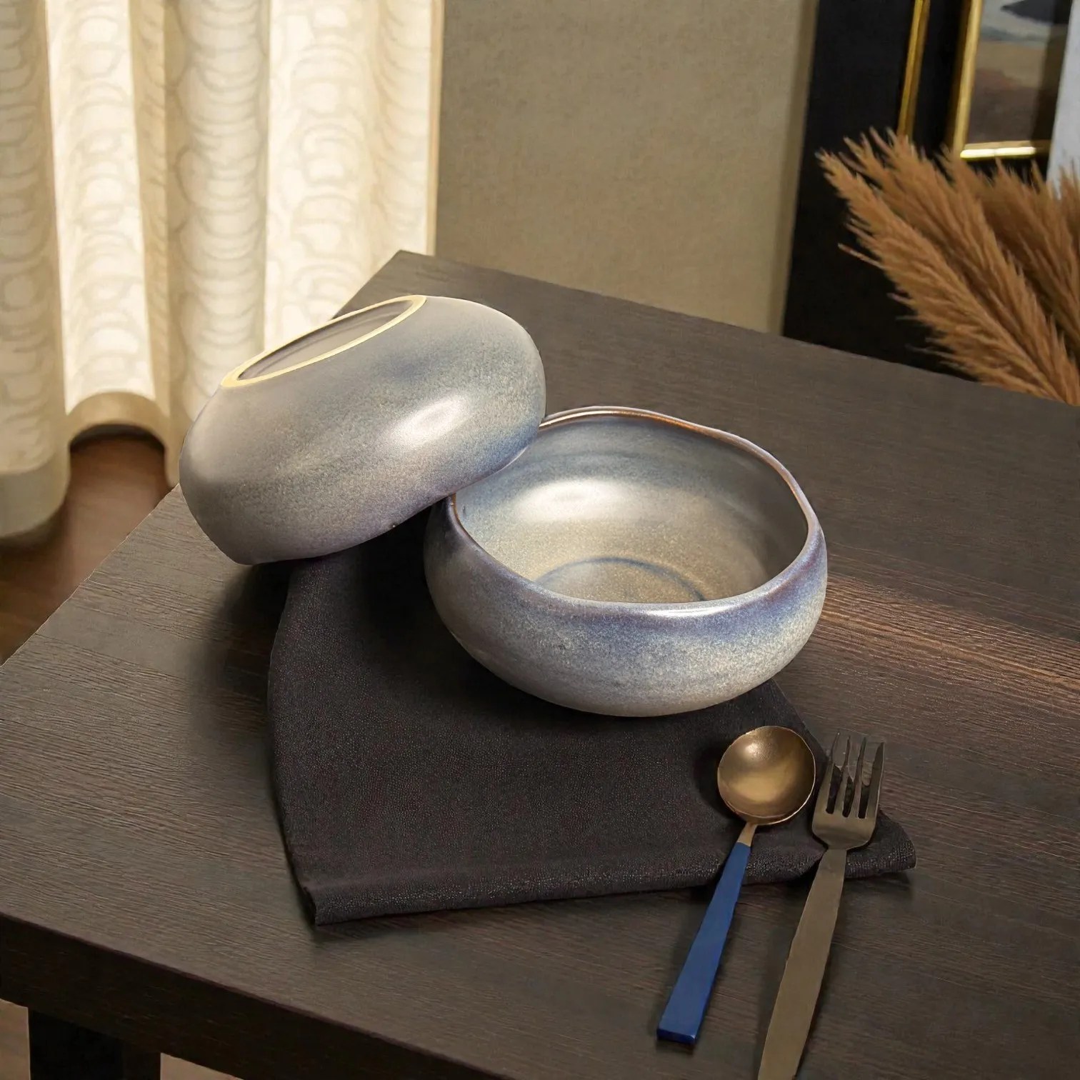 The exterior carries a satin, stone-like texture, while the interior reveals a luminous, speckled graphite tone that catches light subtly (without looking flashy). That contrast makes food pop—greens look fresher, curries look richer, and even a simple bowl of dahi + fruit feels restaurant-ready. Whether you’re hosting guests, setting up a quiet solo dinner, or building a cohesive tablescape, this set elevates the moment without demanding attention.