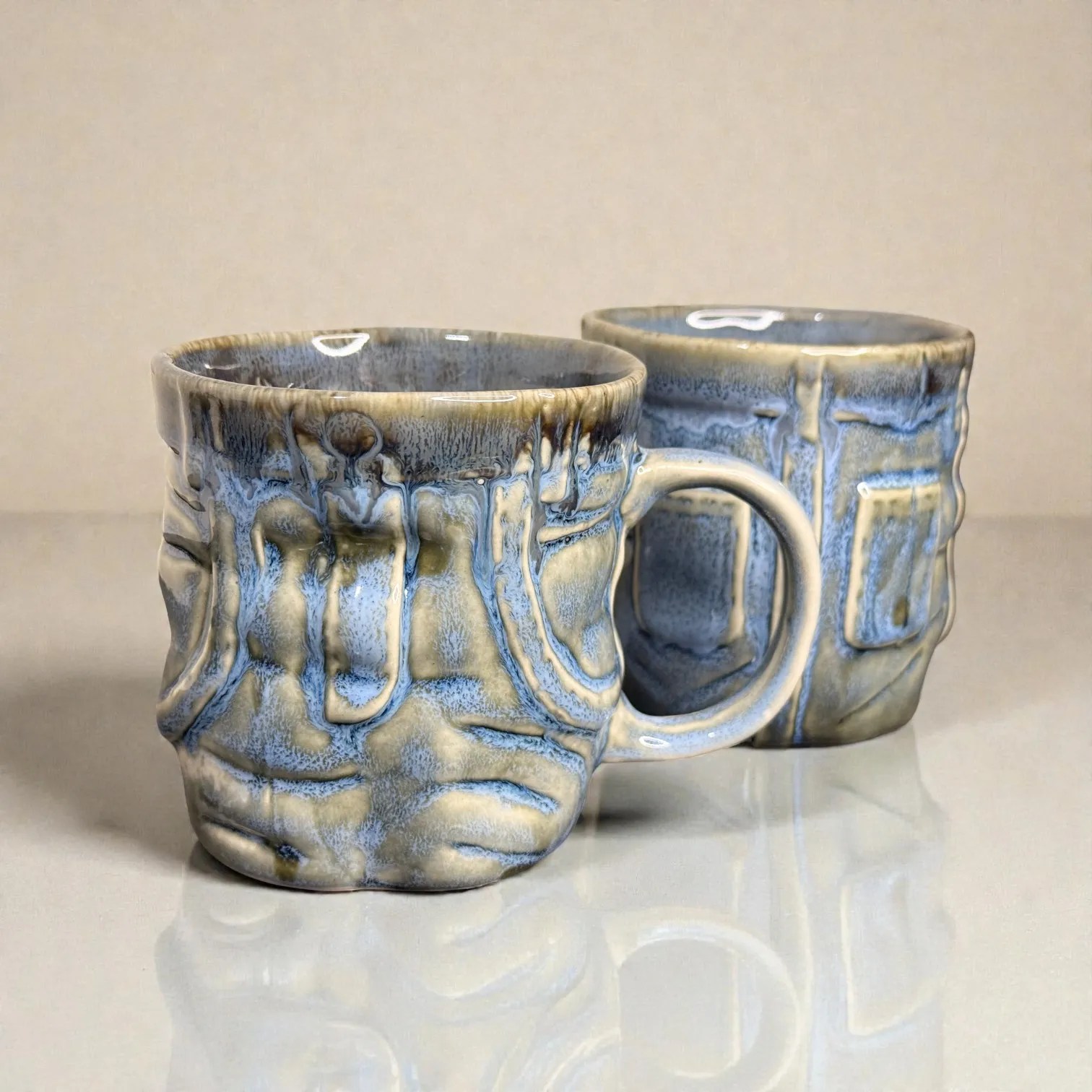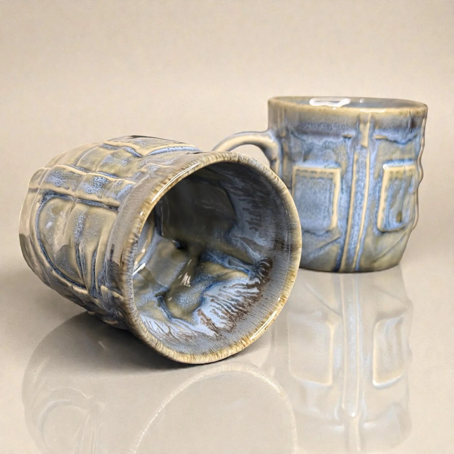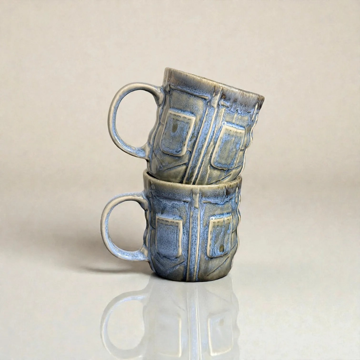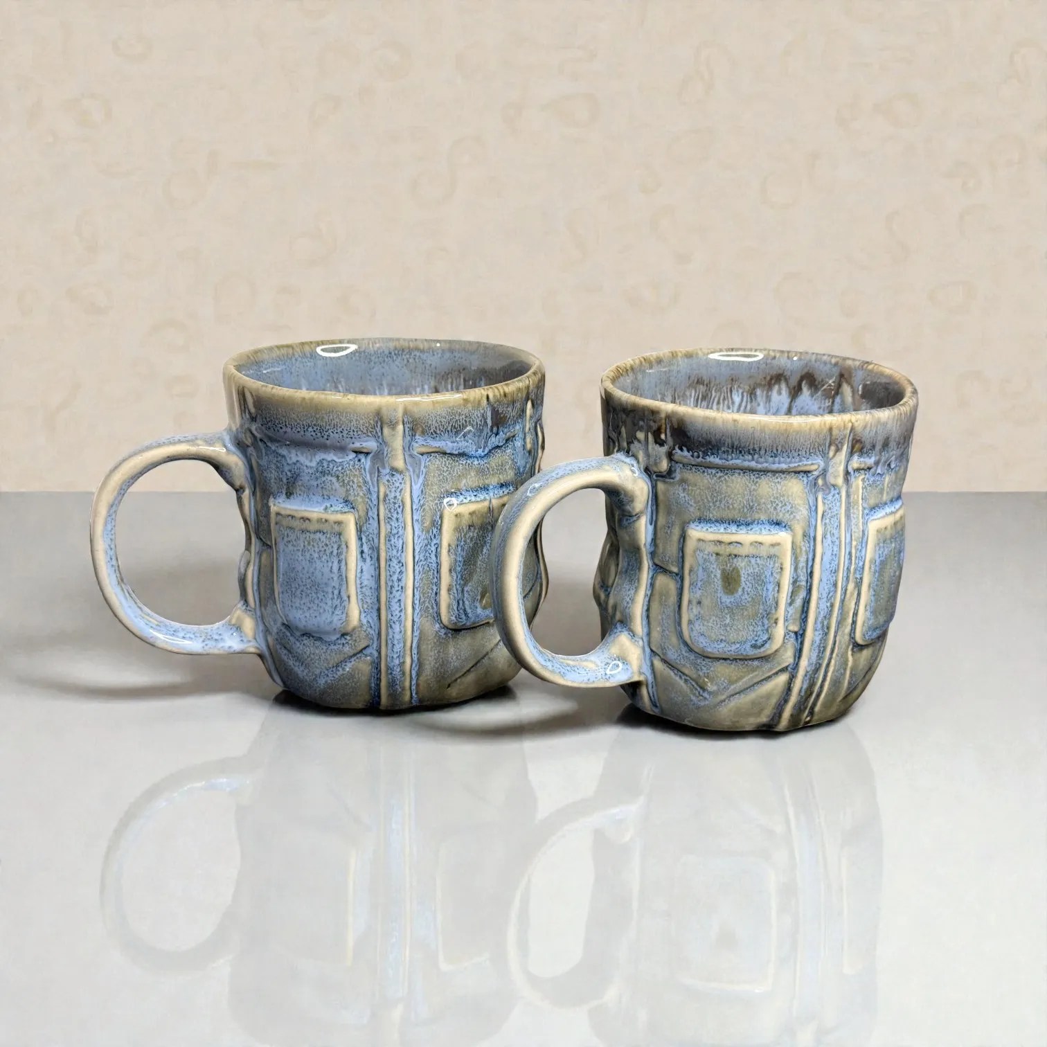 What makes OceanRelief special is its texture-meets-glaze design. The surface features a structured, panel-inspired relief that gives the mug a premium, architectural feel—almost like carved stone—while the glaze flows over it in layered tones of cool blue, grey, and earthy neutrals. This creates depth and variation that looks artisanal, not mass-produced. Every piece carries slight differences in glaze pooling and drip patterns, which is exactly what gives handcrafted ceramics their charm: your set will be uniquely yours.