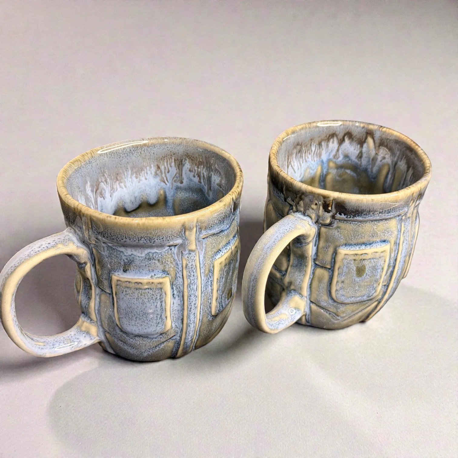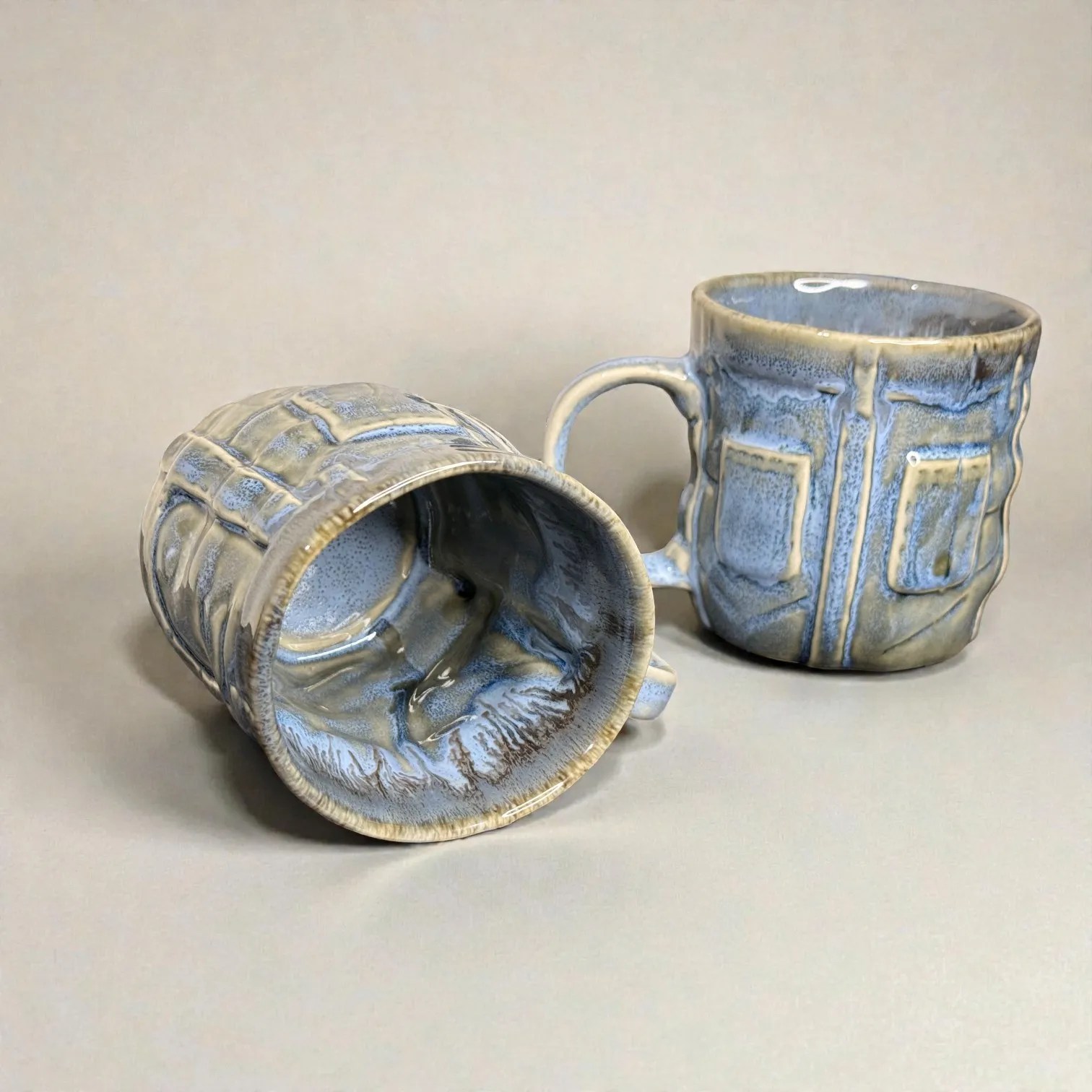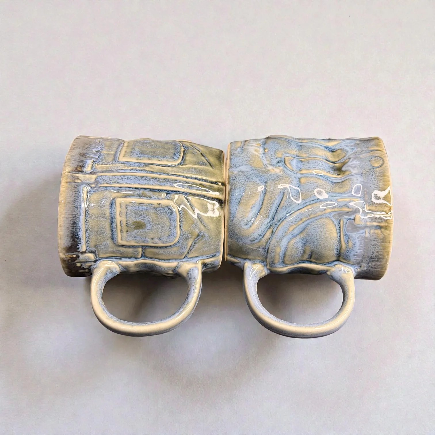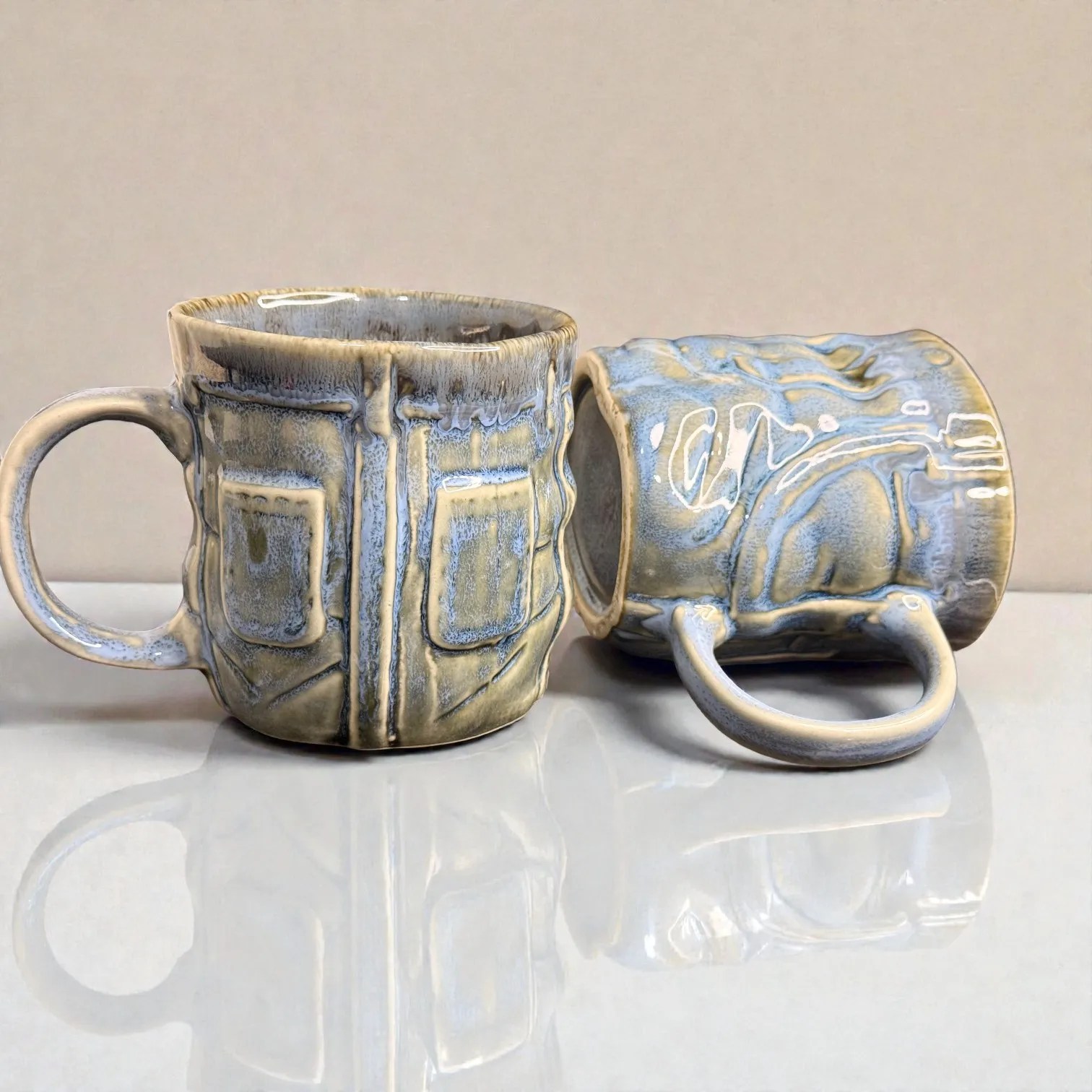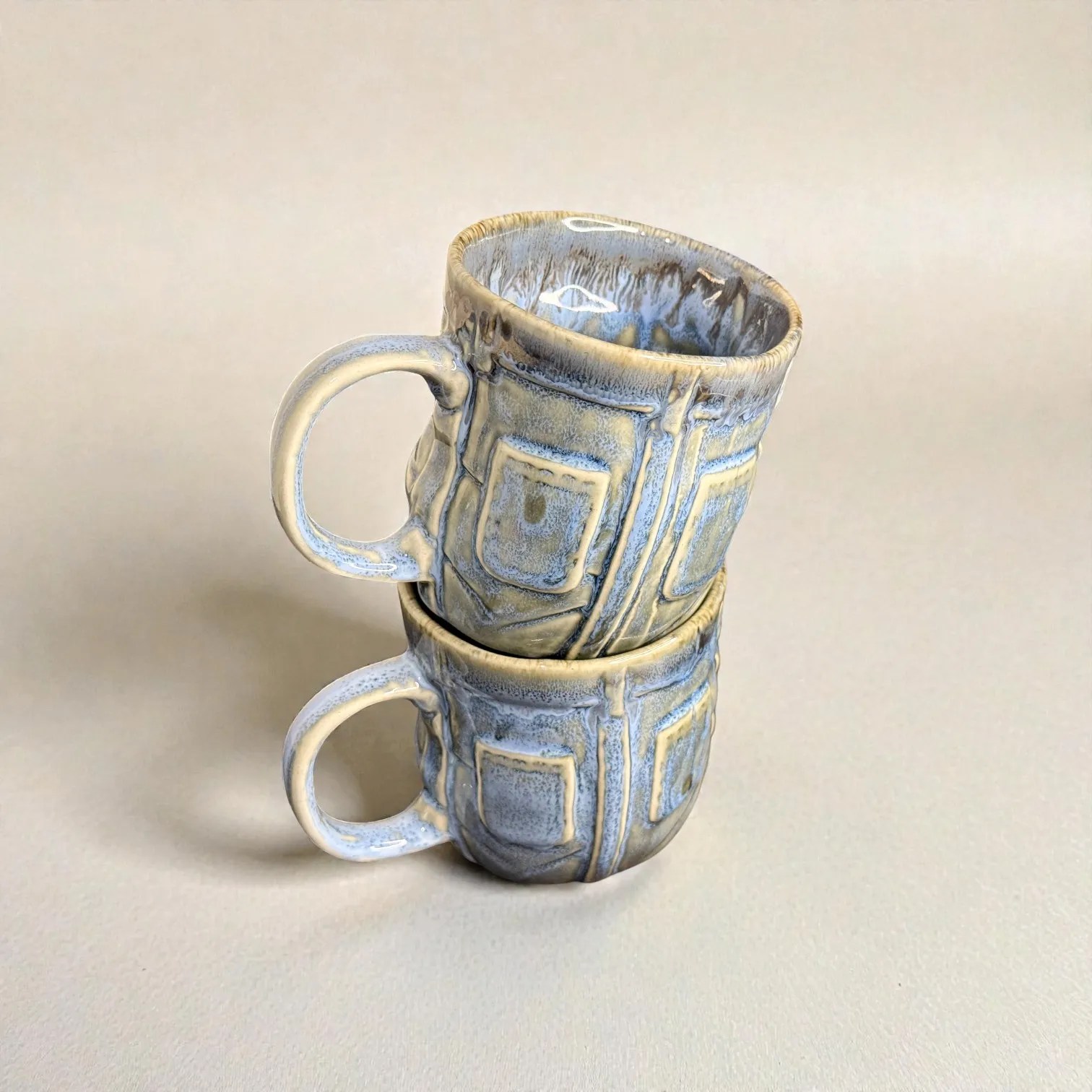 What makes OceanRelief special is its texture-meets-glaze design. The surface features a structured, panel-inspired relief that gives the mug a premium, architectural feel—almost like carved stone—while the glaze flows over it in layered tones of cool blue, grey, and earthy neutrals. This creates depth and variation that looks artisanal, not mass-produced. Every piece carries slight differences in glaze pooling and drip patterns, which is exactly what gives handcrafted ceramics their charm: your set will be uniquely yours.
