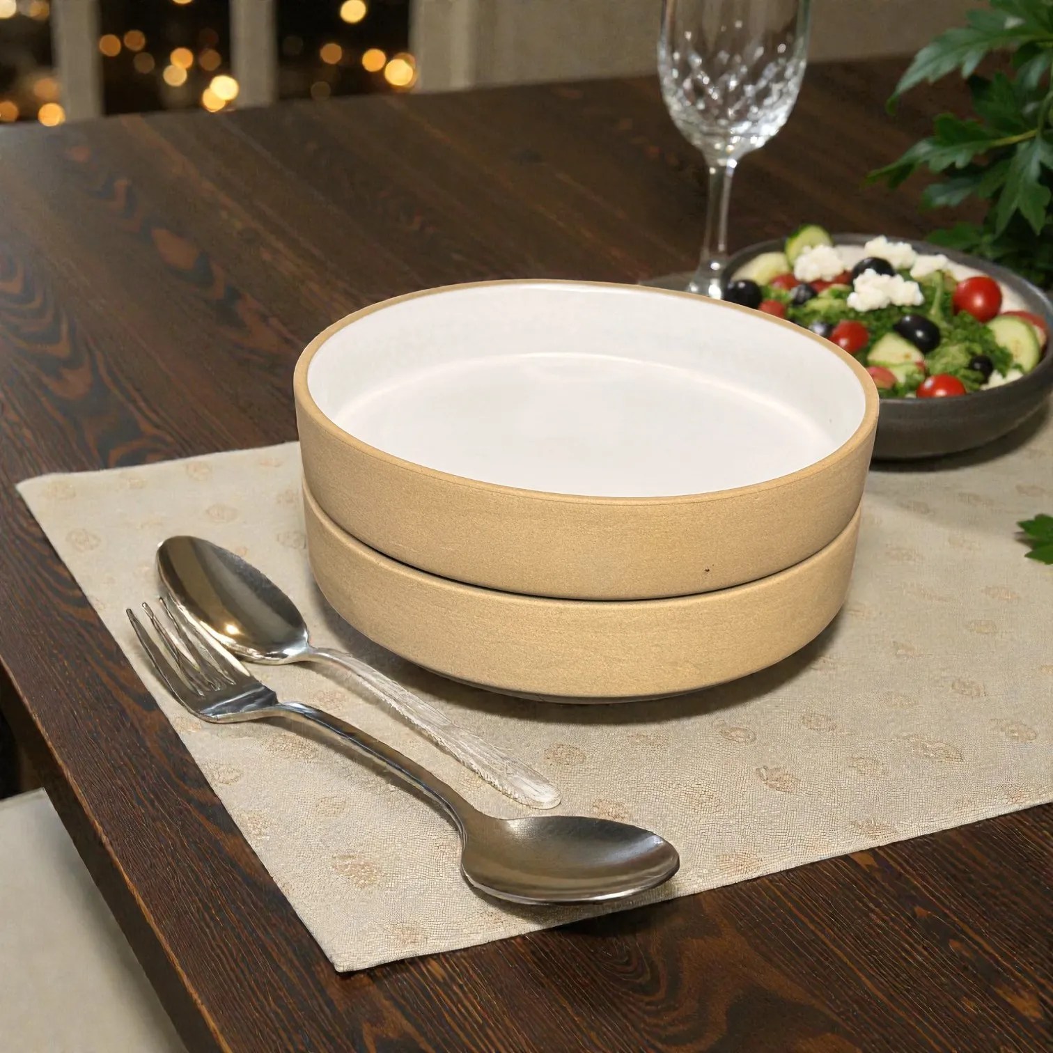 The 8” x 1.5” proportion is the sweet spot for shared serving and aesthetic plating. It gives you enough surface area to layer ingredients (greens + toppings + dressing) without overcrowding, while keeping a refined low height that looks modern on the table. These bowls also work beautifully as side-serve bowls during hosting—two matching pieces bring symmetry to the spread and make your table look intentionally curated rather than mixed and random.