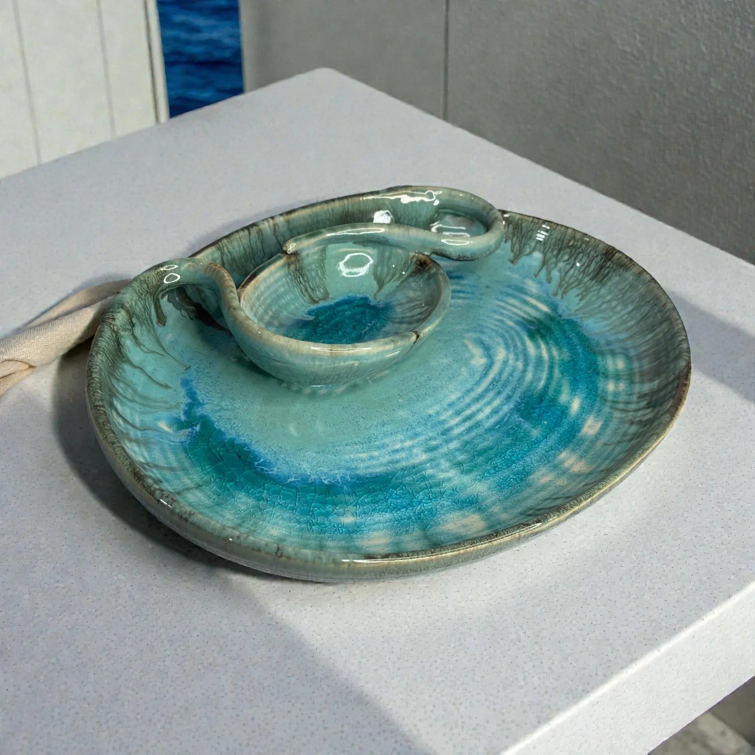 Harmiche Laguna Luxe Crackle Glaze Ceramic Medium Oval Chip and Dip Platter with Centre Dip Bowl โ Coastal Blue (12 x 9 Inch)