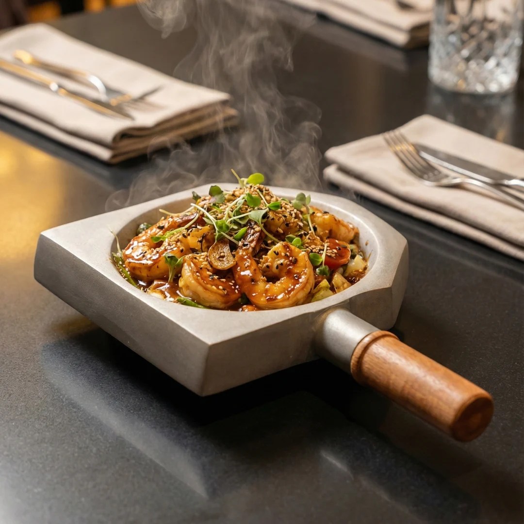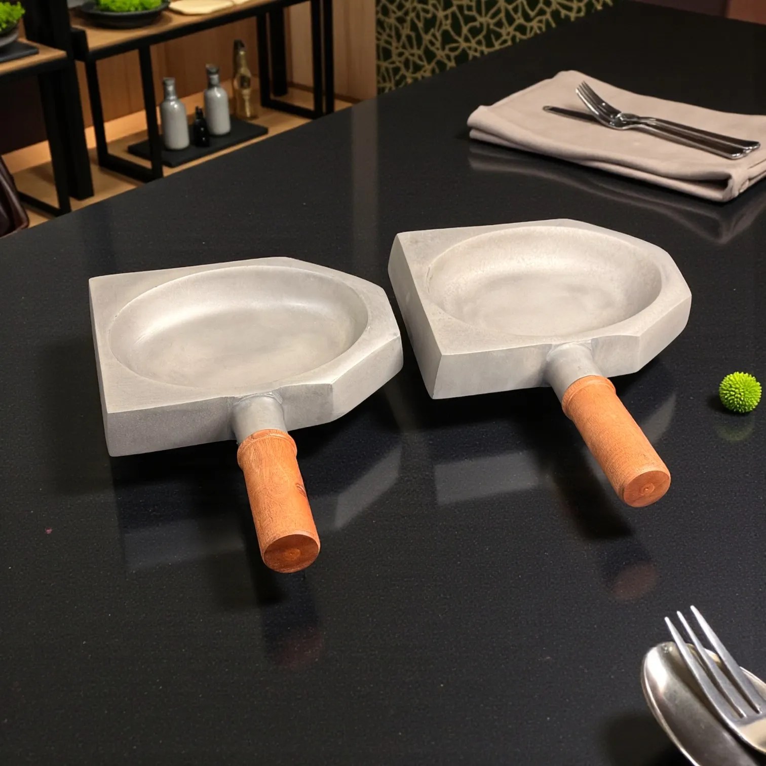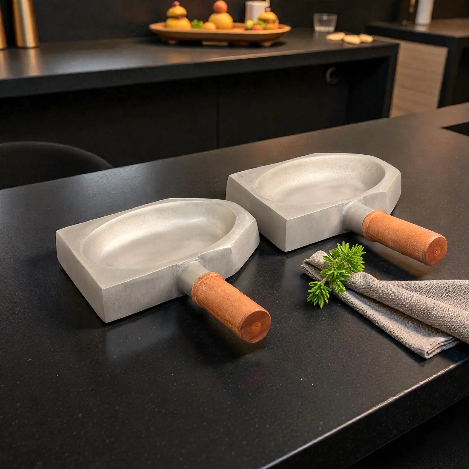 Bring restaurant-style presentation home with the Harmiche SlateGrip Hard Anodised Aluminium Servers (Set of 2) — modern tabletop serveware designed to make everyday food look intentional, elevated, and guest-ready. Each piece blends a wide, shallow serving bowl with a sculpted geometric base and a warm wooden handle, giving you the visual impact of a mini skillet and the practicality of a carry-and-serve dish. The compact footprint is ideal for small portions, couple dining, and curated party platters.
