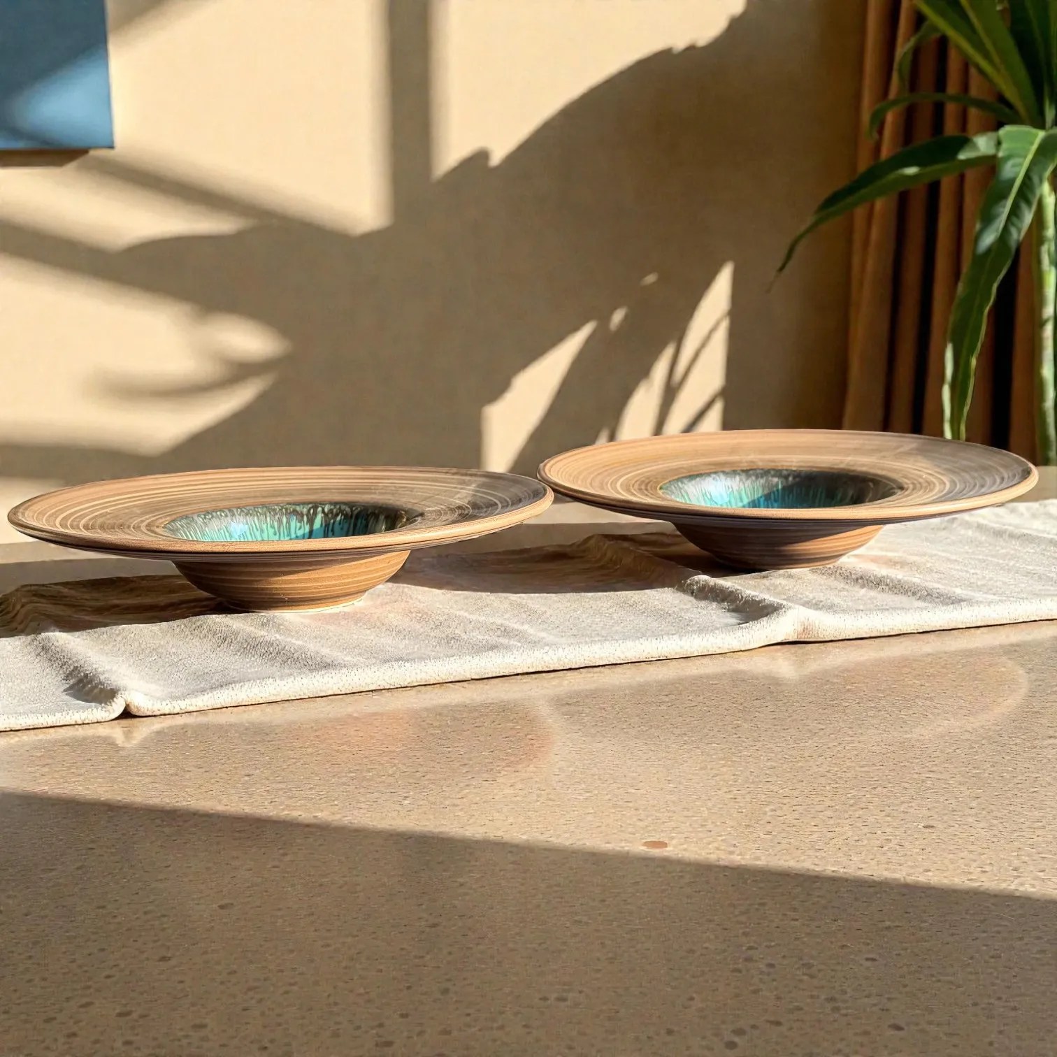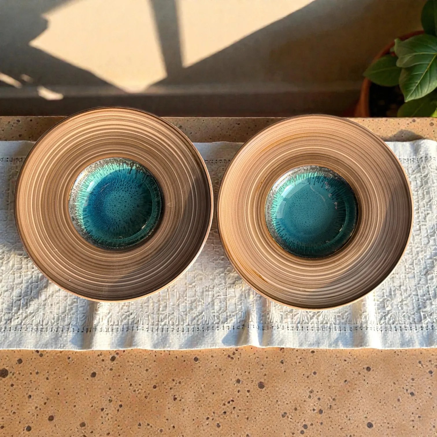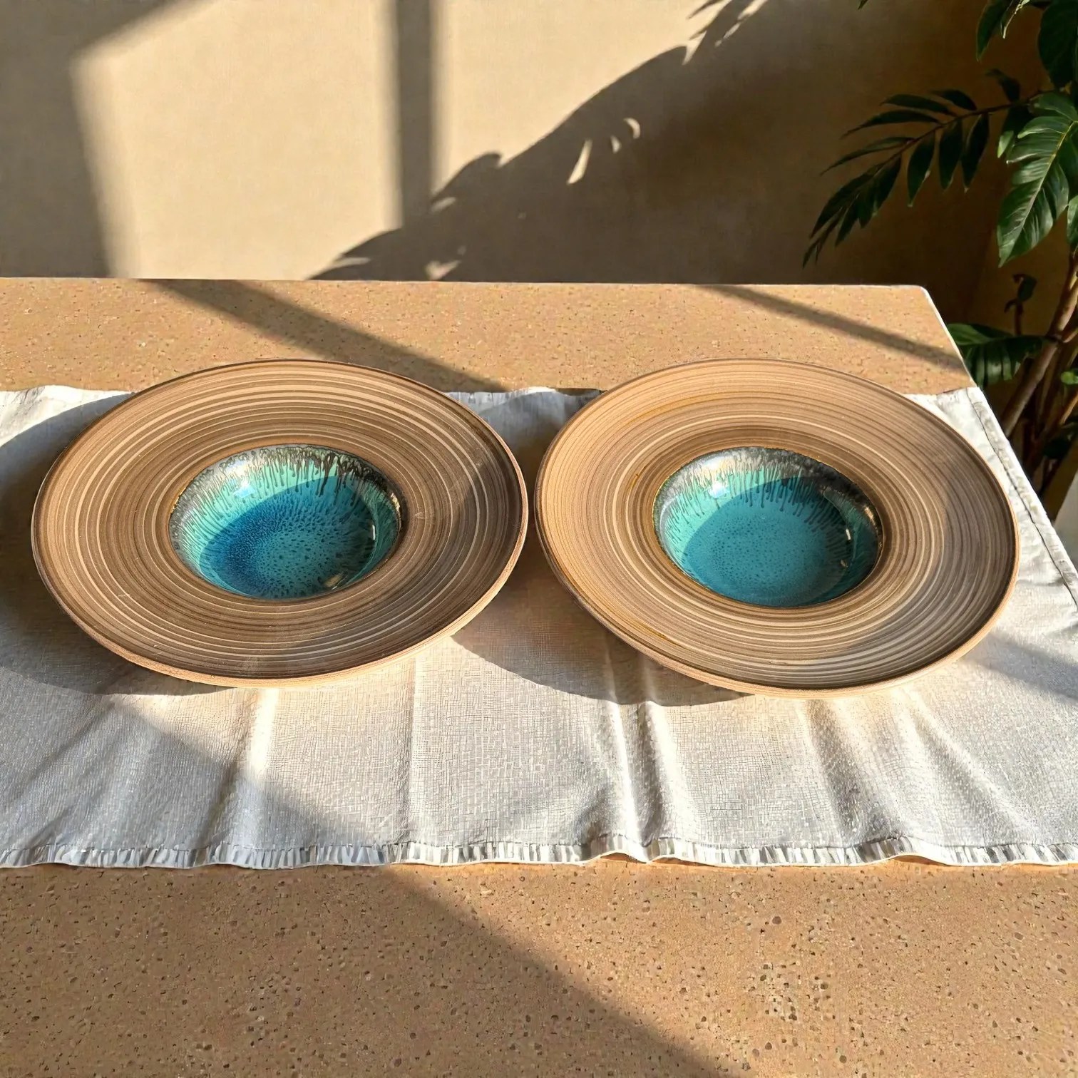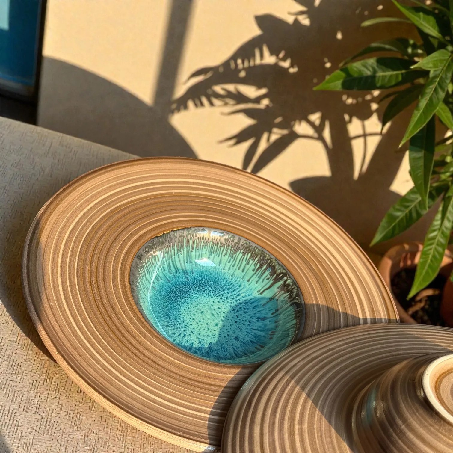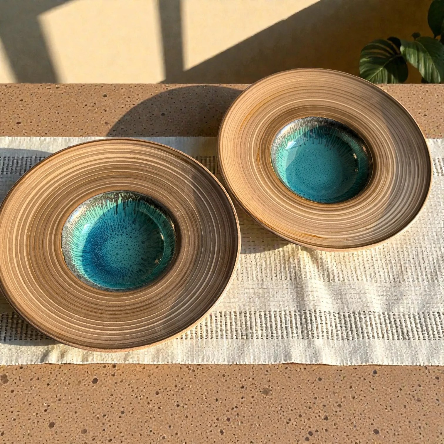 Bring restaurant-style plating home with the Harmiche TideLagoon Spiral Rim Ceramic Pasta Plates (Set of 2)—a statement serveware essential designed for pasta, risotto, ramen, salads, and elegant Indian mains. Each plate blends earthy, wheel-thrown texture with a striking aqua reactive glaze center, creating that “wow” moment the second it hits the table.